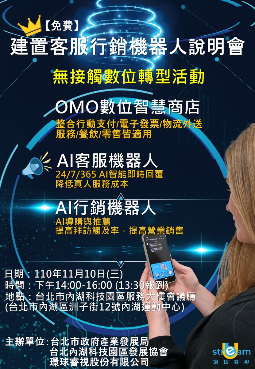 環球睿視將於11/10(星期三)下午2:00 (1:30開始報到),於台北市內湖科技園區服務大樓(台北市內湖運動中心)舉辦:免費建置客服行銷機器人 - 無接觸數位轉型活動專案及線下實體說明會,您可先填寫報名表單,讓主辦方初步了解您的需求,通過後會有專人與您聯繫。