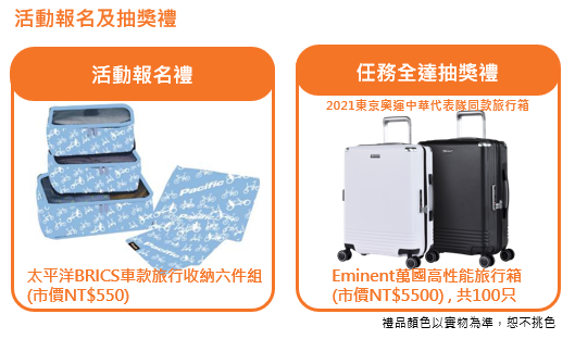 - 郵寄地點僅限台澎金馬地區。海外報名者請填台灣地區集運地址,自行處理集運事宜;離島地區寄送時間較長,禮贈品預計於寄出後的2~4周內收到。兌獎說明: