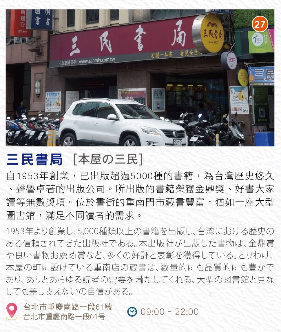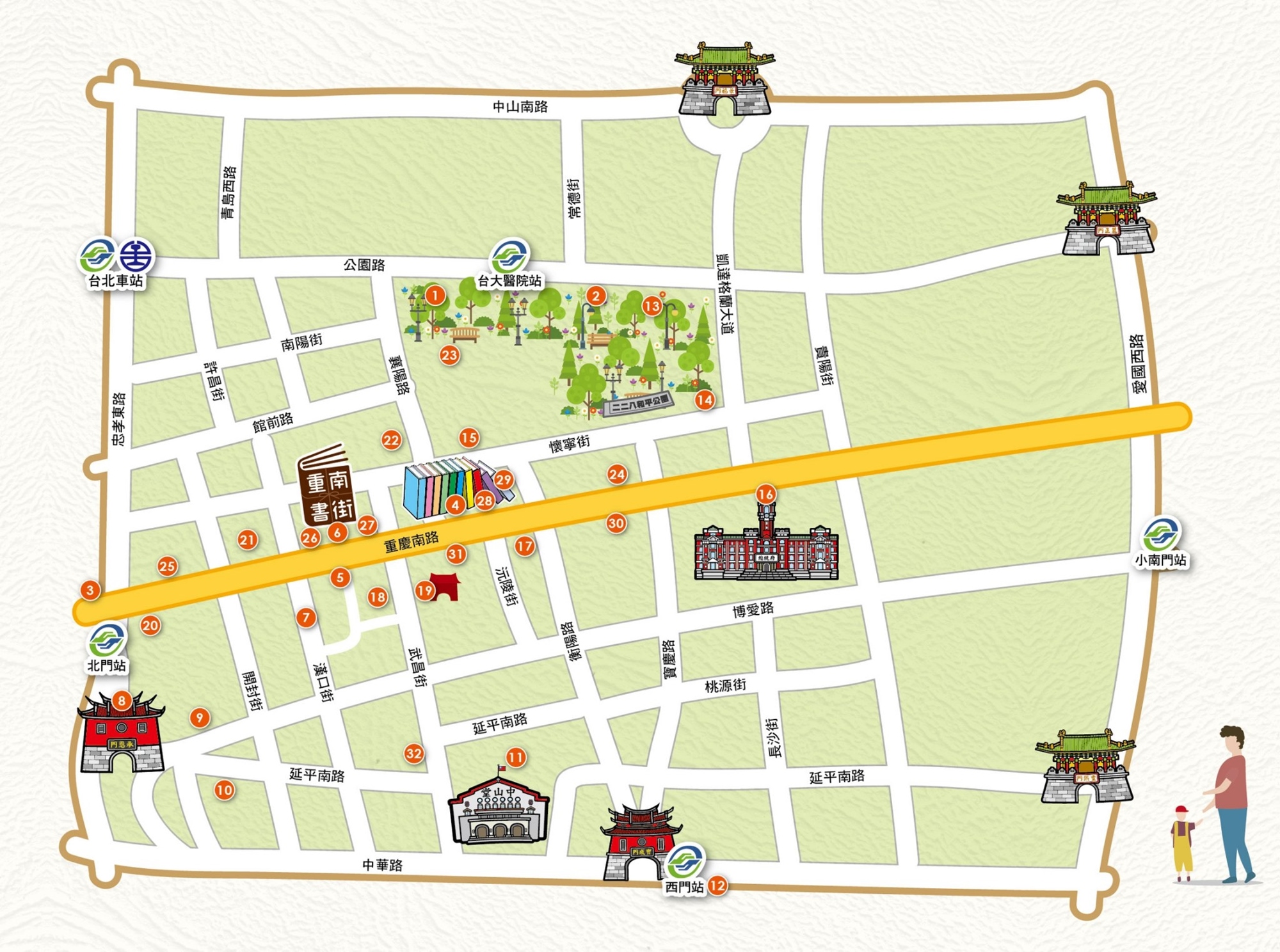 重南書街位於台北城中地區,是臺北設市百年來的主要商業地帶,有著豐富的書店、旅店、雜貨、咖啡、小吃、服飾…等特色商店,同時也是綠地保存(二二八公園)及古蹟文化(北門、撫台洋樓、中山堂、省城隍廟、總統府…等)的觀光景點,這些都是我們重要的綠色資本!