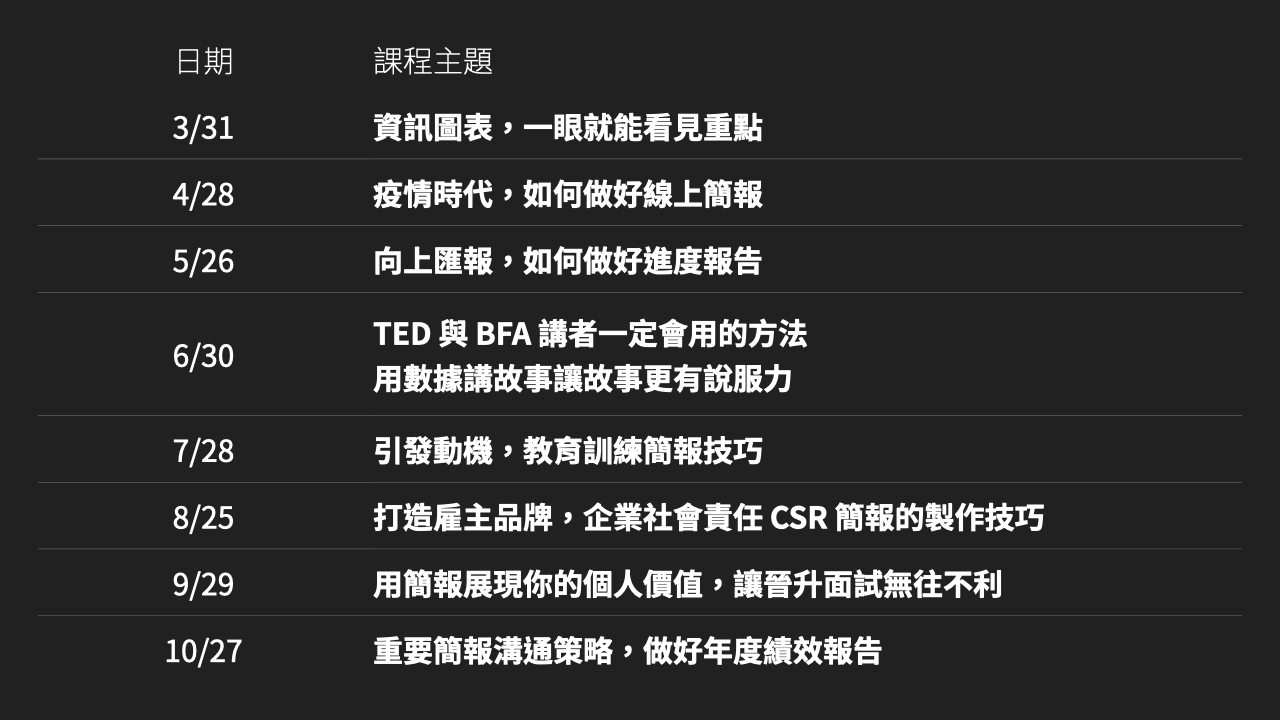 本堂課程享有永久觀看,讓您在任何時間、任何會議上進行簡報上的優化,也能幫助您在每一次的會議中有效展現個人和團隊的工作成果。