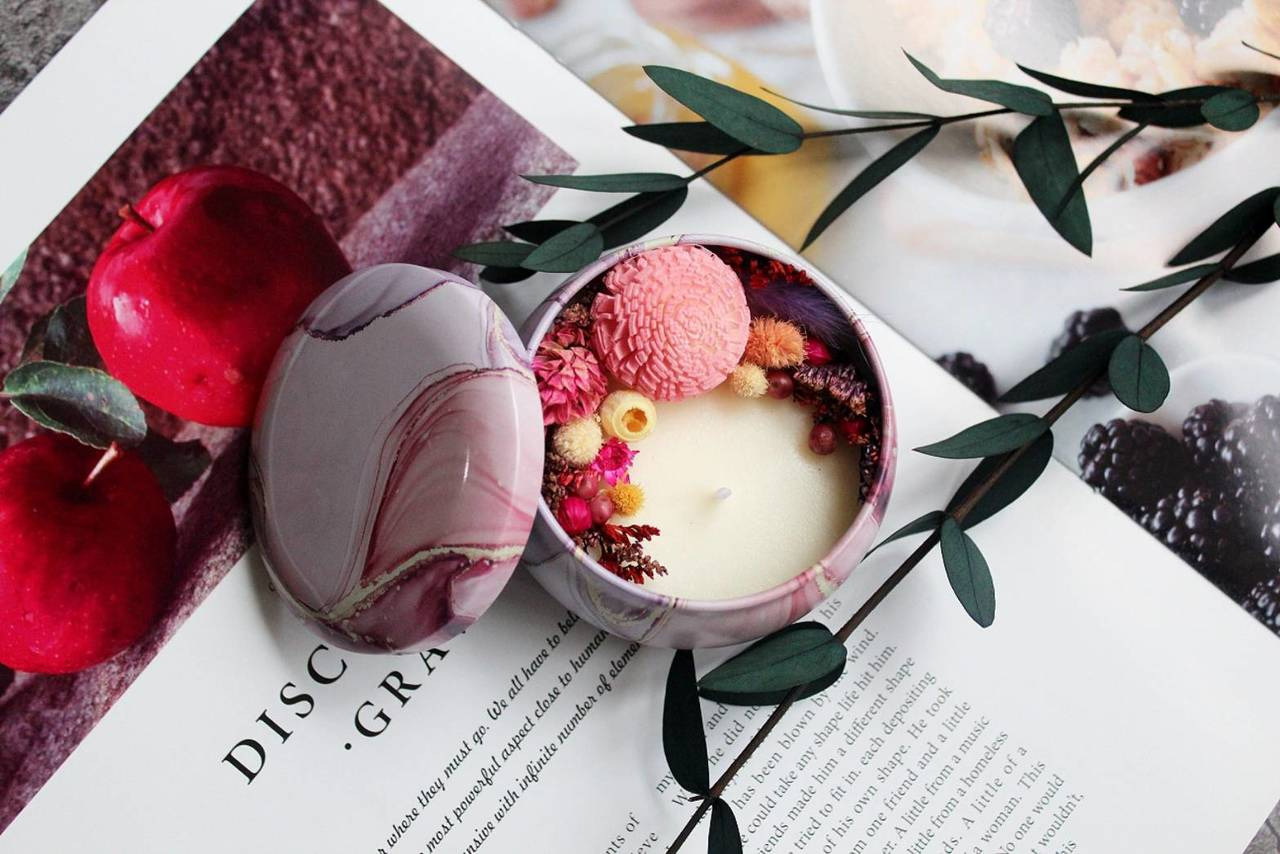 乾燥花的美是獨一無二的,搭配不同的花與調配不同的顏色,使用天然大豆蠟與香氛精油,交織編成美麗的一幅畫。透過香氛精油,滴在蠟燭裡面,放在居家室內,不燃燒也有著擴香的作用,即使放在不起眼的小角落,都構成視覺嗅覺的饗宴,讓手作設計師幫你設計,製作可以妝點自己家的收藏品!