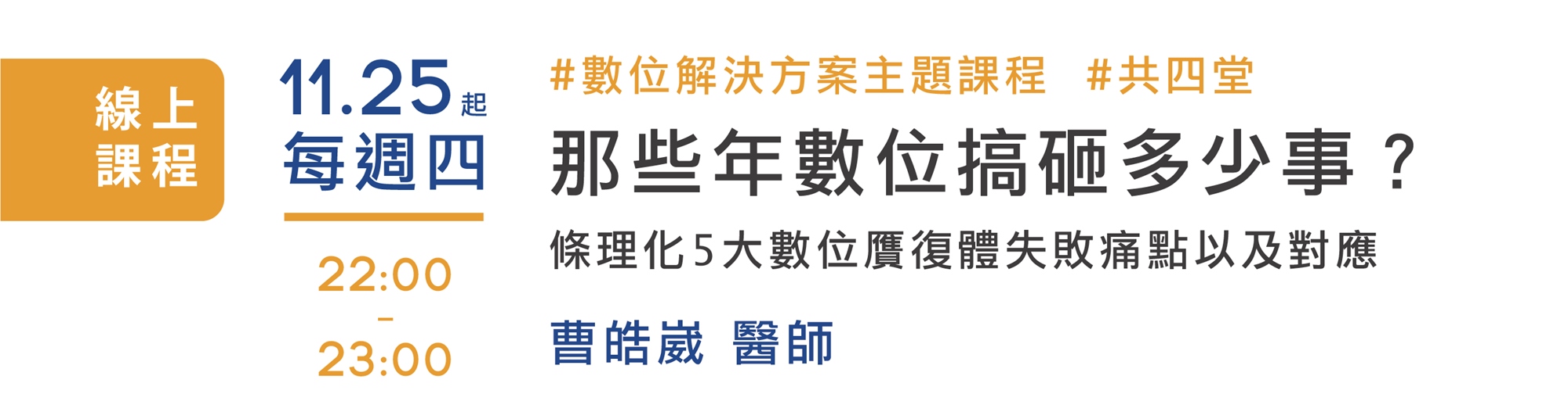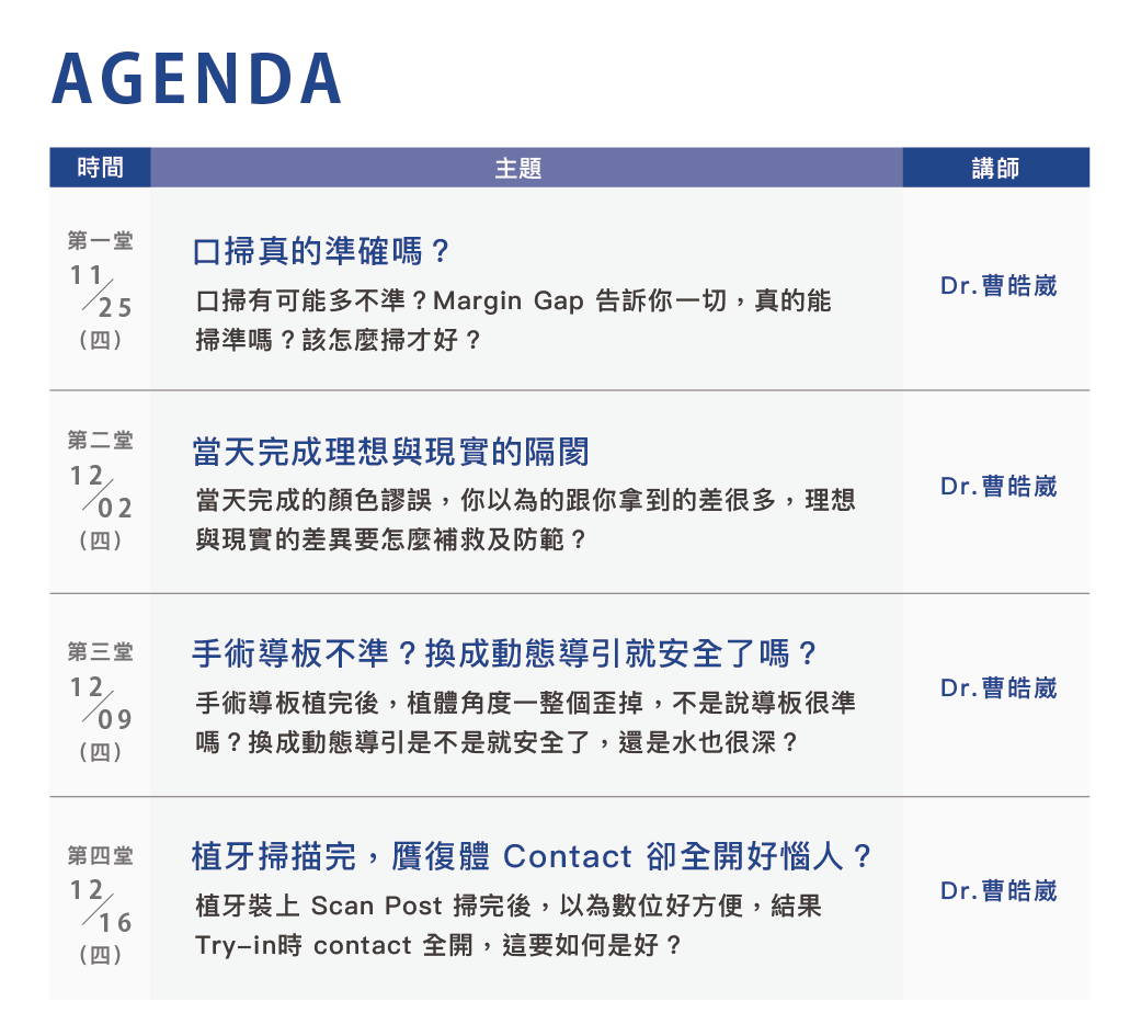 這一次,我們將利用四堂線上課程與一堂實作課程告訴數位使用者, 該如何使用您的設備並且順利完成臨床治療,打破數位設備變成診間裝飾品的詛咒。