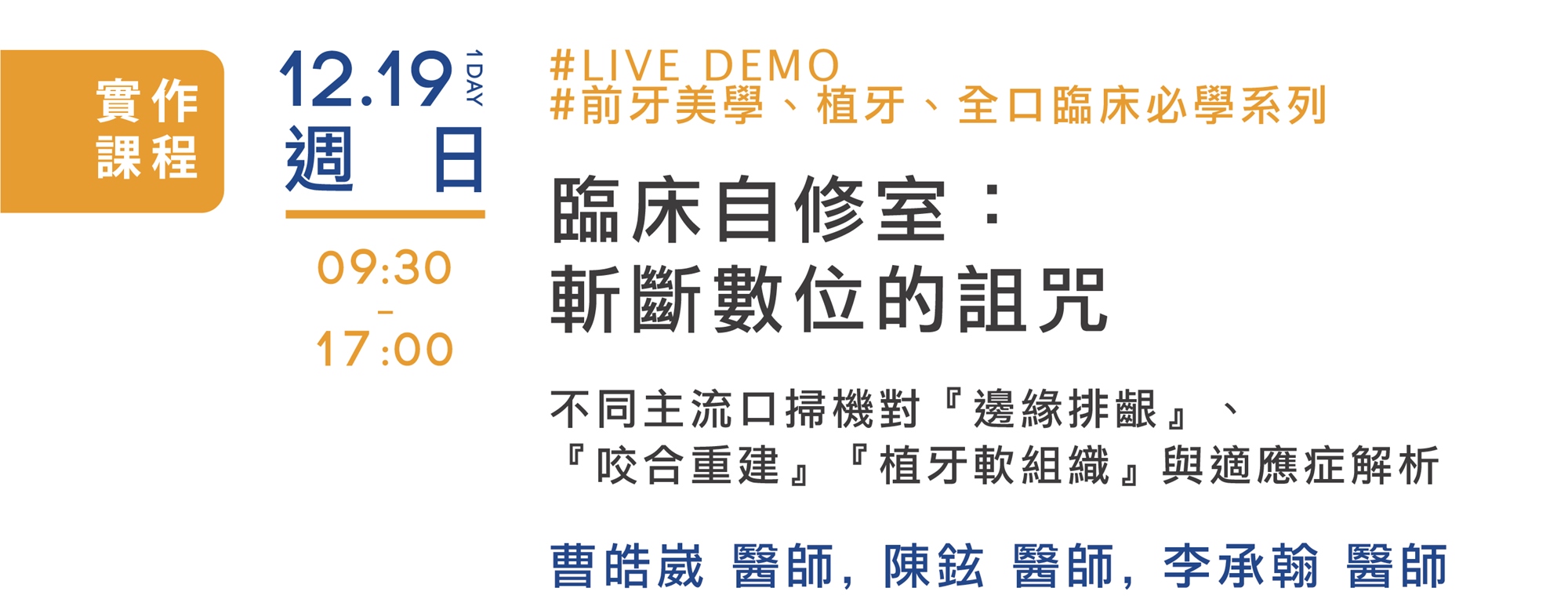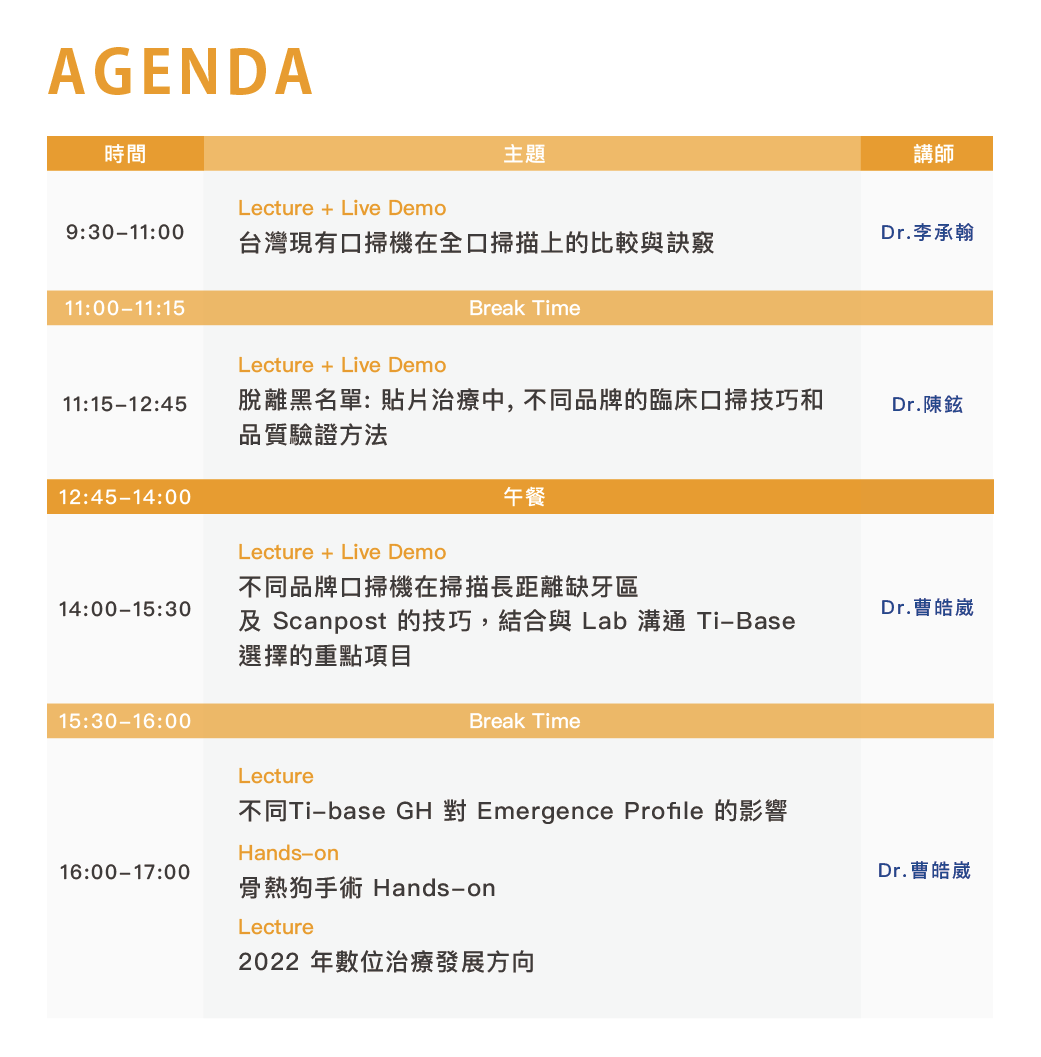 這場研討會推薦給沒有自己的Lab及技師的醫師,你可以學到數位贋復體失敗的原因以及對應處理。如果你有自己的技師以及Lab,就更不能錯過這堂課程了,曾經悅庭遇到的問題可能你正在經歷著。
