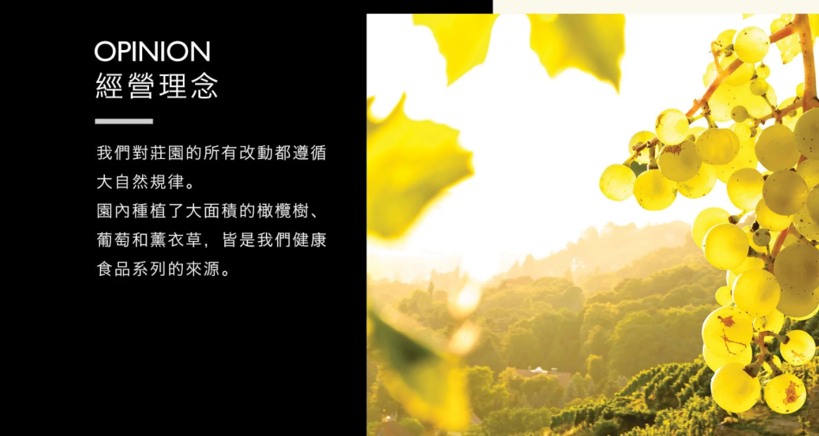 深知新鮮對營養保存的重要性,葡萄莊園裡有釀酒廠,橄欖園內也有榨油廠,以生產橄欖多酚高、酸價低、耐煎煮炒炸的品質最優特級初榨橄欖油。莊園的薰衣草園旁,設置了數座蜂箱,使生蜂蜜帶著淡淡的薰衣草味。