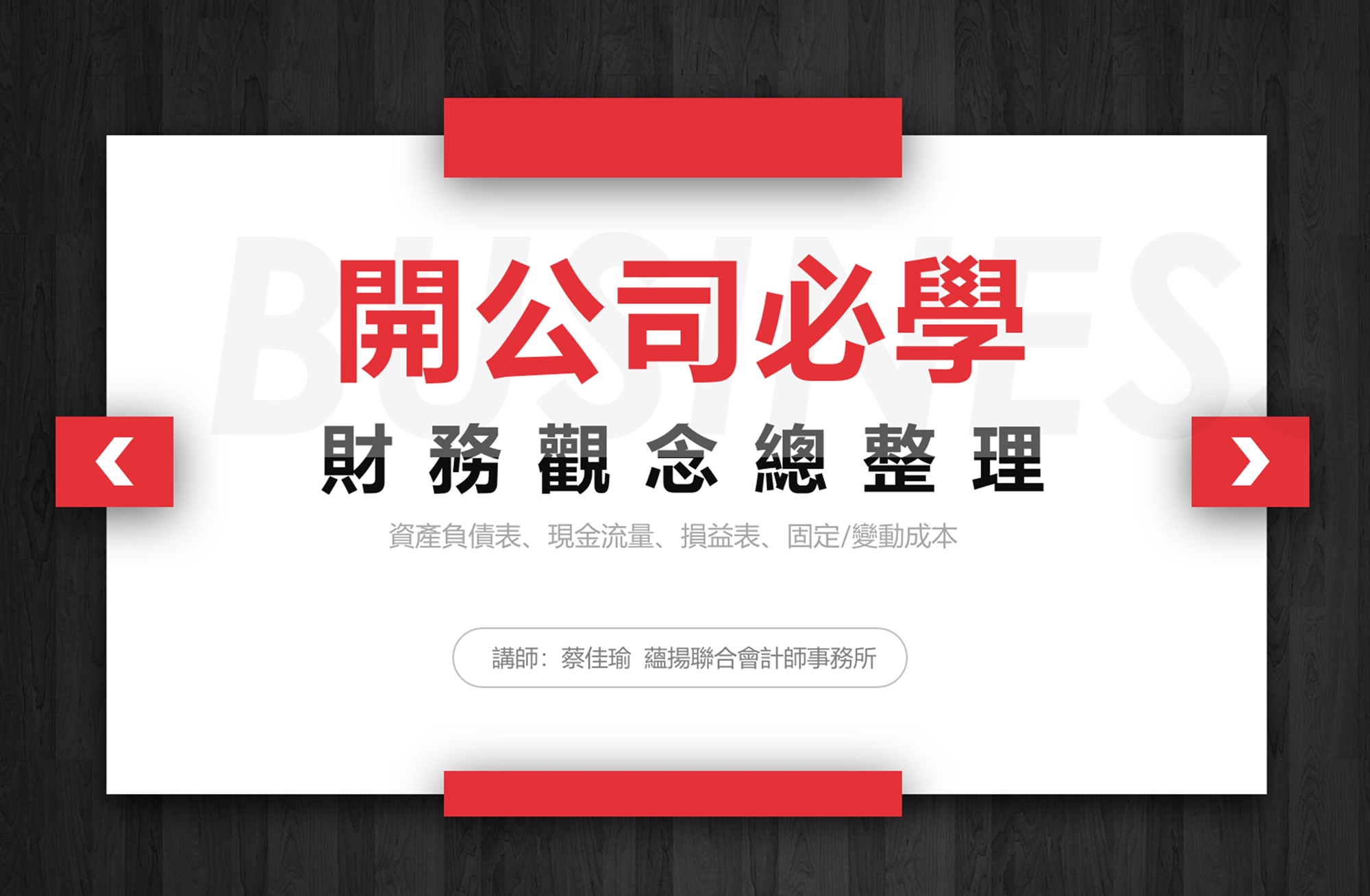 本次課程特別邀請《蘊揚聯合會計師事務所》蔡佳瑜會計師,來教大家公司基本財務知識、透過實際案例的分享,讓創業者有正確的公司財務觀念,減少創業過程中的冤枉路。