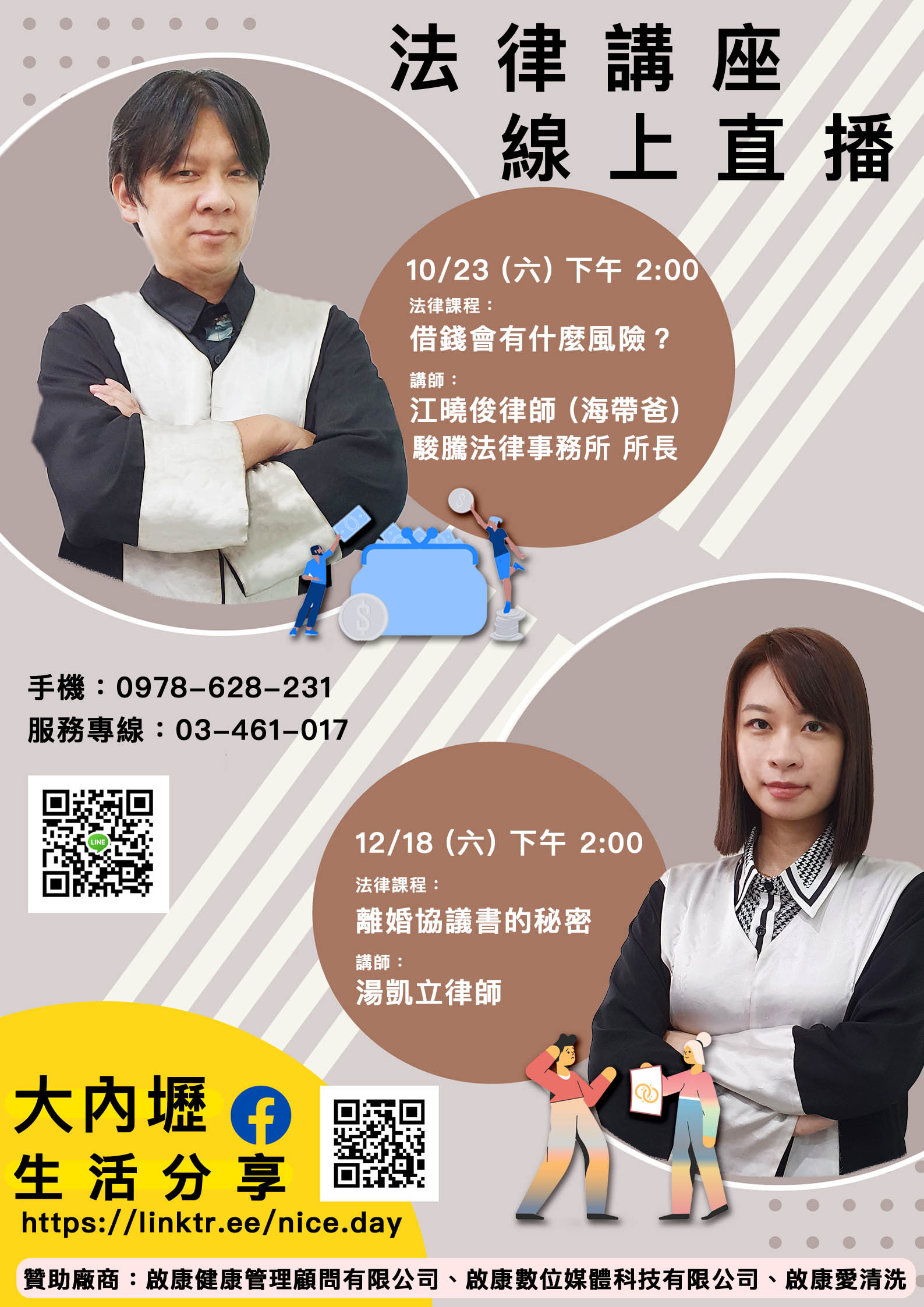 其實,只要注意一些事項,就可以避免血汗錢拿不回來,又可避免不借錢破壞大家感情。本次講座,將會說明借錢可能遇到的風險,並且教您如果解決風險、保衛自身權益,千萬不要錯過喔!