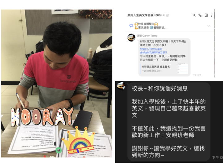 Carter在2020年2月左右報名課程,他原是一位缺乏自信的外送員,因為不喜歡朝九晚五的工程師工作,離職探索人生,無意中看到我們的說明會,參加後隔天就付款完成參加我們的課程,二個月他就突破自我,完成人生第一篇英文自我介紹演說,課程中他不但完成成為英文分享者的夢想,舉辦公益線上英文學習分享會,在課程準備結束前,更確立新的志業 - 教育,他找到了兒童教育的工作。從外送員到教育工作者,這門英文課不但讓他自信說出英文,也讓他改變自己了的人生。