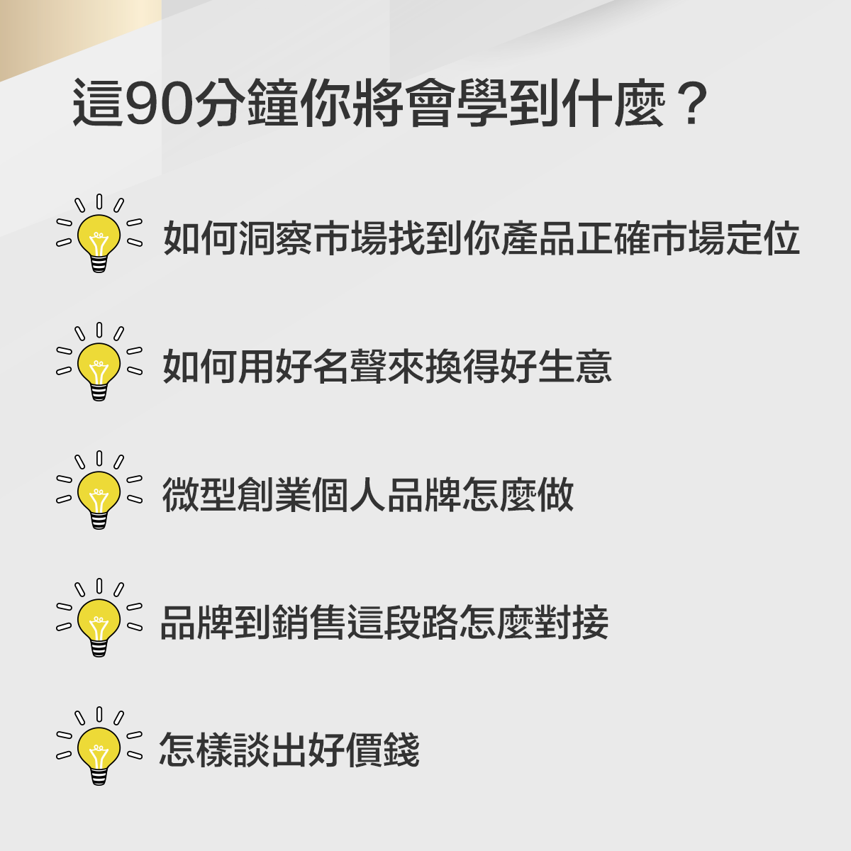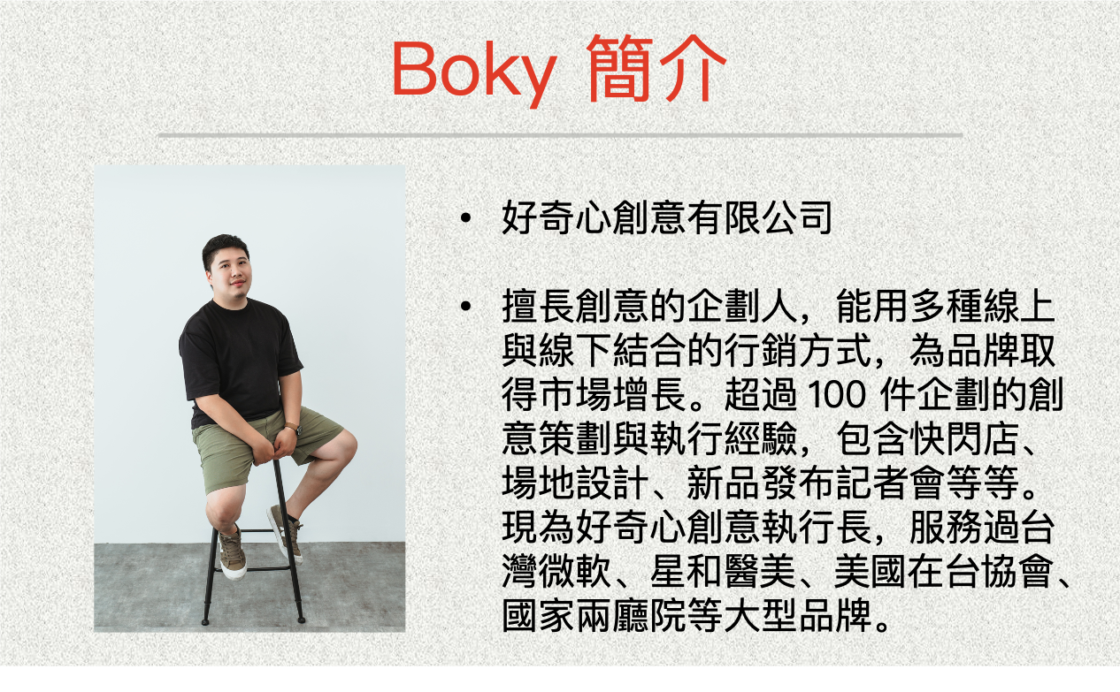 這場講座,我們將帶你對接市場,找到市場機會點,有市場理論架構,也有落地執行好方法,讓你一創業就有好開始,心法+工具一次掌握,想要做出一門品牌好生意真的非難事!