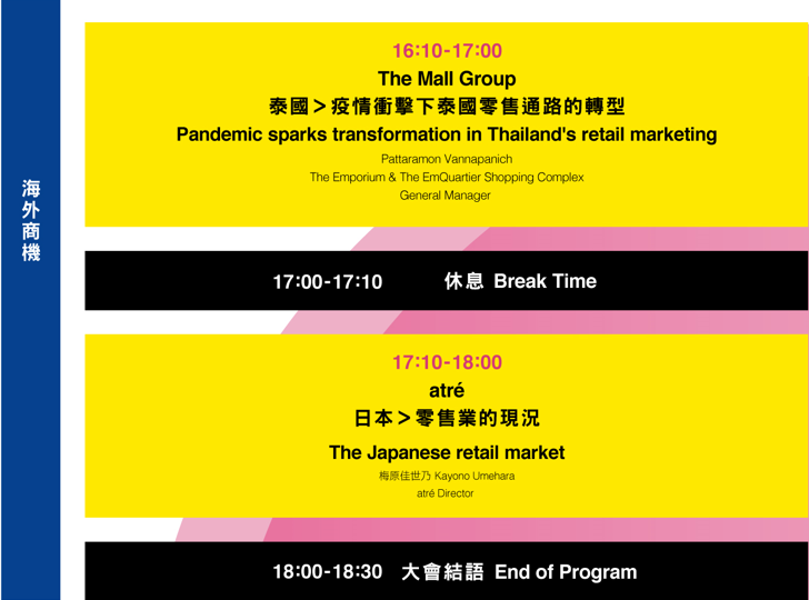 邀集日本Atré 、泰國The Mall Group兩大通路,分享兩國生活風格品在實體通路及線上通路的發展,及台灣品牌該如何進入兩國市場。