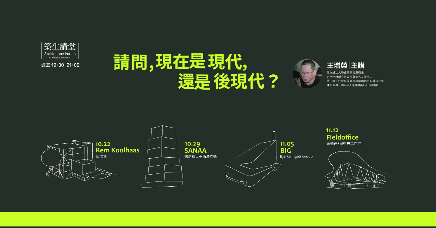 本課程主要是闡明有關現代、後現代,以及現在的建築狀態,四次的課程裡,將分別細讀四組建築師:庫哈斯(Rem Koolhaas)、SANAA(妹島和世+西澤立衛)、BIG(Bjarke Ingels Group)、黃聲遠+田中央工作群的作品,以窺視當今建築發展的特質,是現代?後現代?或其他時代?