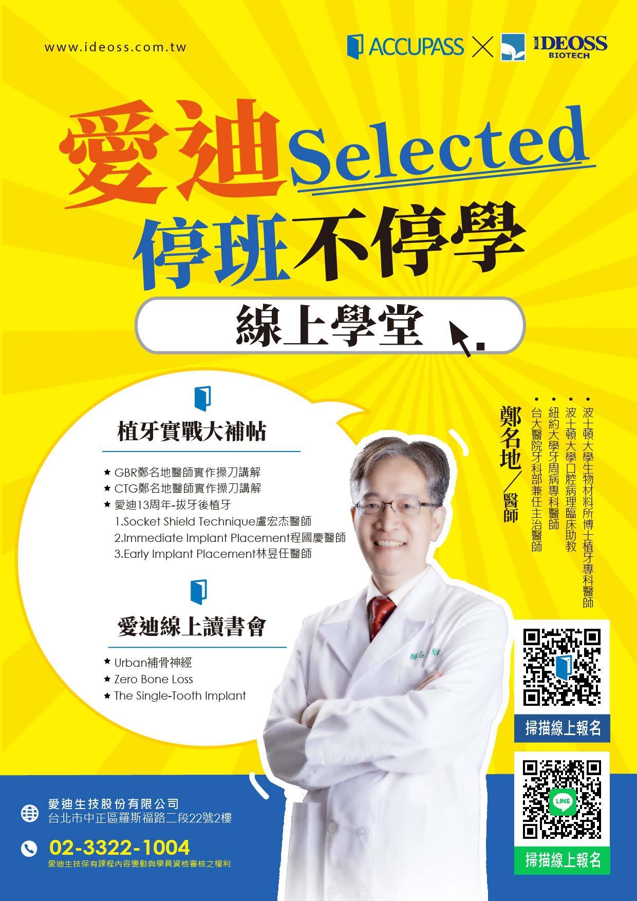線上學堂課程含括植牙實戰大補帖及線上讀書會(Urban補骨聖經/-Zero Bone Loss/The Single-Tooth Implant)。