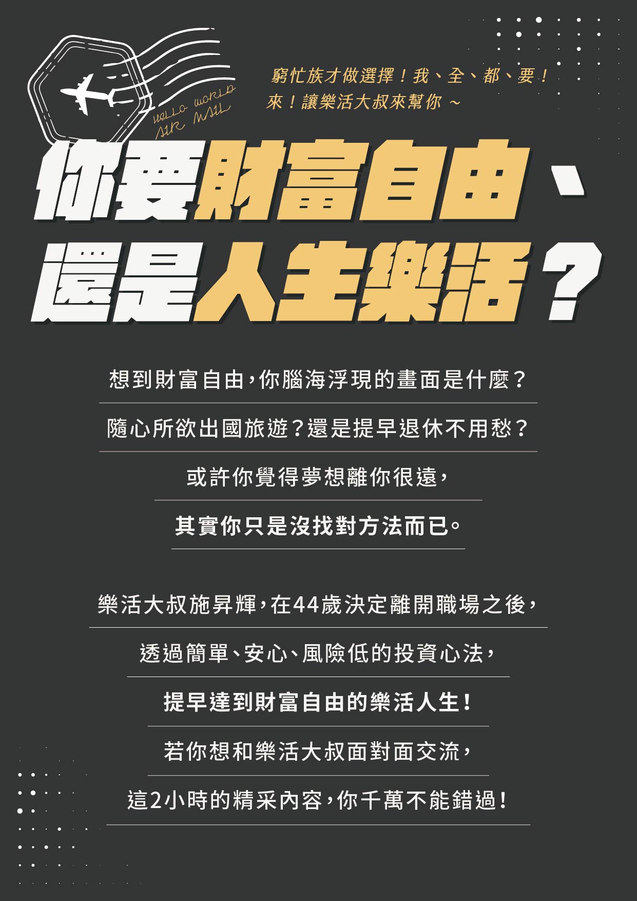 這2小時樂活大叔將會分享他的獨門投資心法,