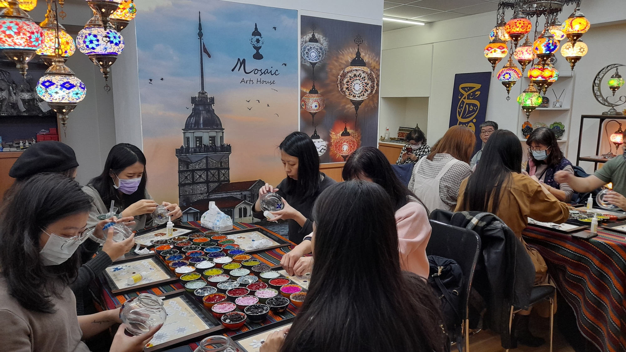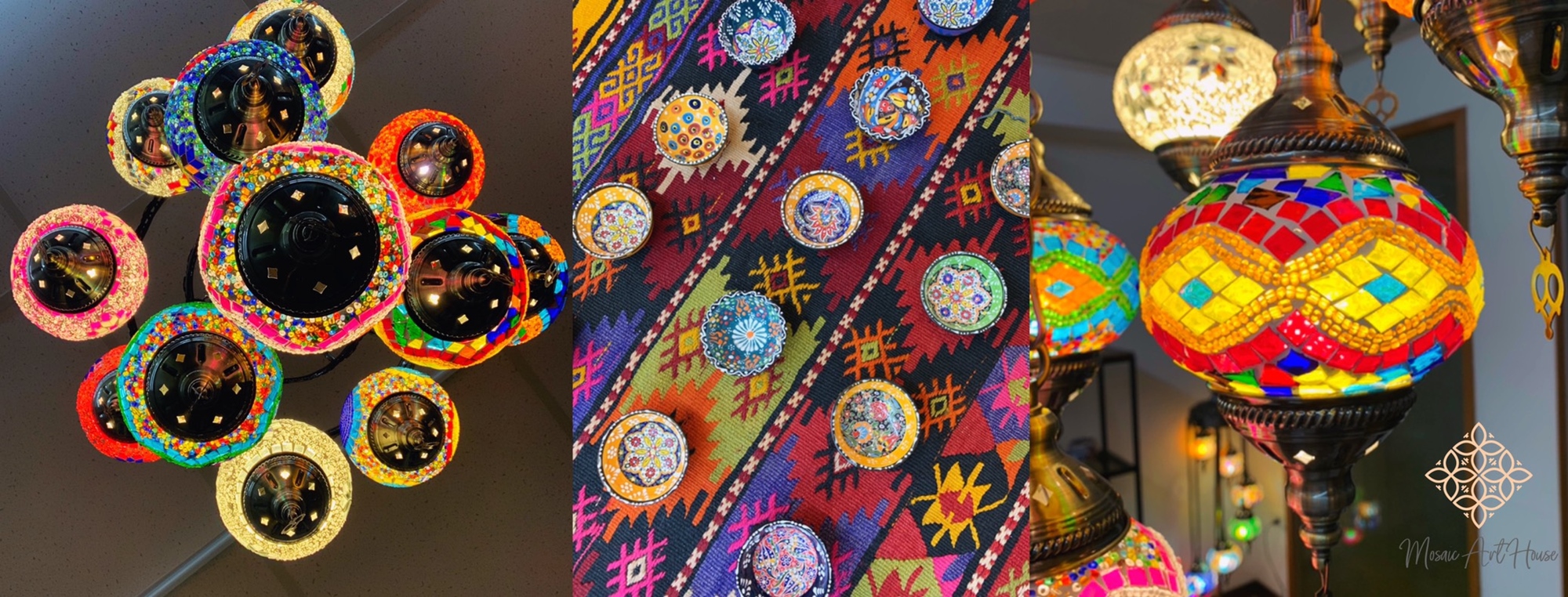 Enjoy making a traditional Turkish lamp that lighten your room with your family, couples or friends Create an everlasting gift for your loved ones with your own creativity or design samples while no experience or prior knowledge required. Enlighten your nights with the traditional Turkish lamp that you build piece by piece by using 12 colors of different shaped hand-cut glasses and beads.