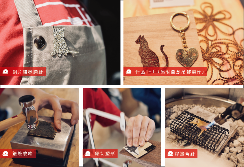 課程中可學習到銅片鋸切、鍛敲、銼修及焊接等金工技巧。另外,提供之銅片數量,除了可讓您製作胸針外,還能額外自行設計與製作墜飾。作品1+1,您也可以創作出各式的飾品套組!