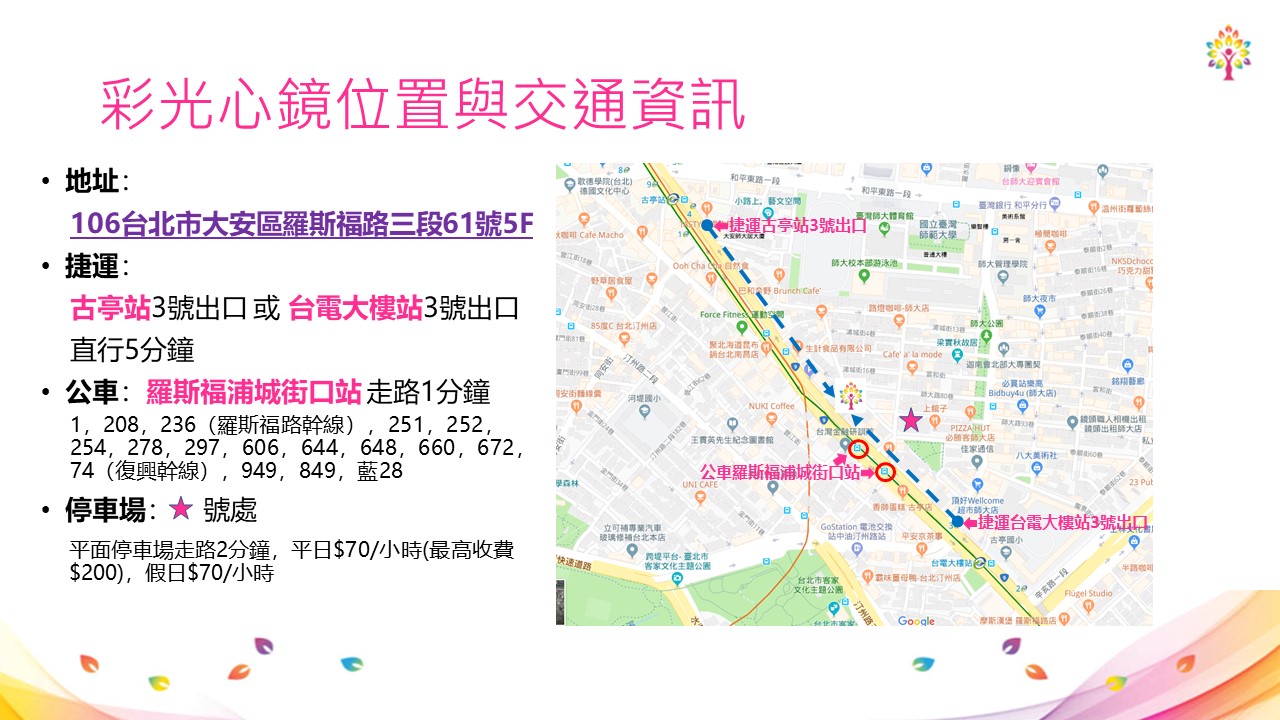 若您想預約一對一現場體驗,地點為彩光心鏡(台北市大安區羅斯福路三段61號5F,古亭捷運站3號出口/台電大樓捷運站3號出口走路五分鐘)