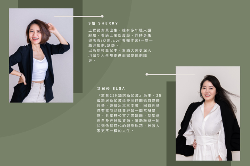 因此,經過這些年來的歷練,想分享我們的生命經驗和人脈資源建立方法給妳,幫助妳思考突破,在2022年開始成為更好的自己。