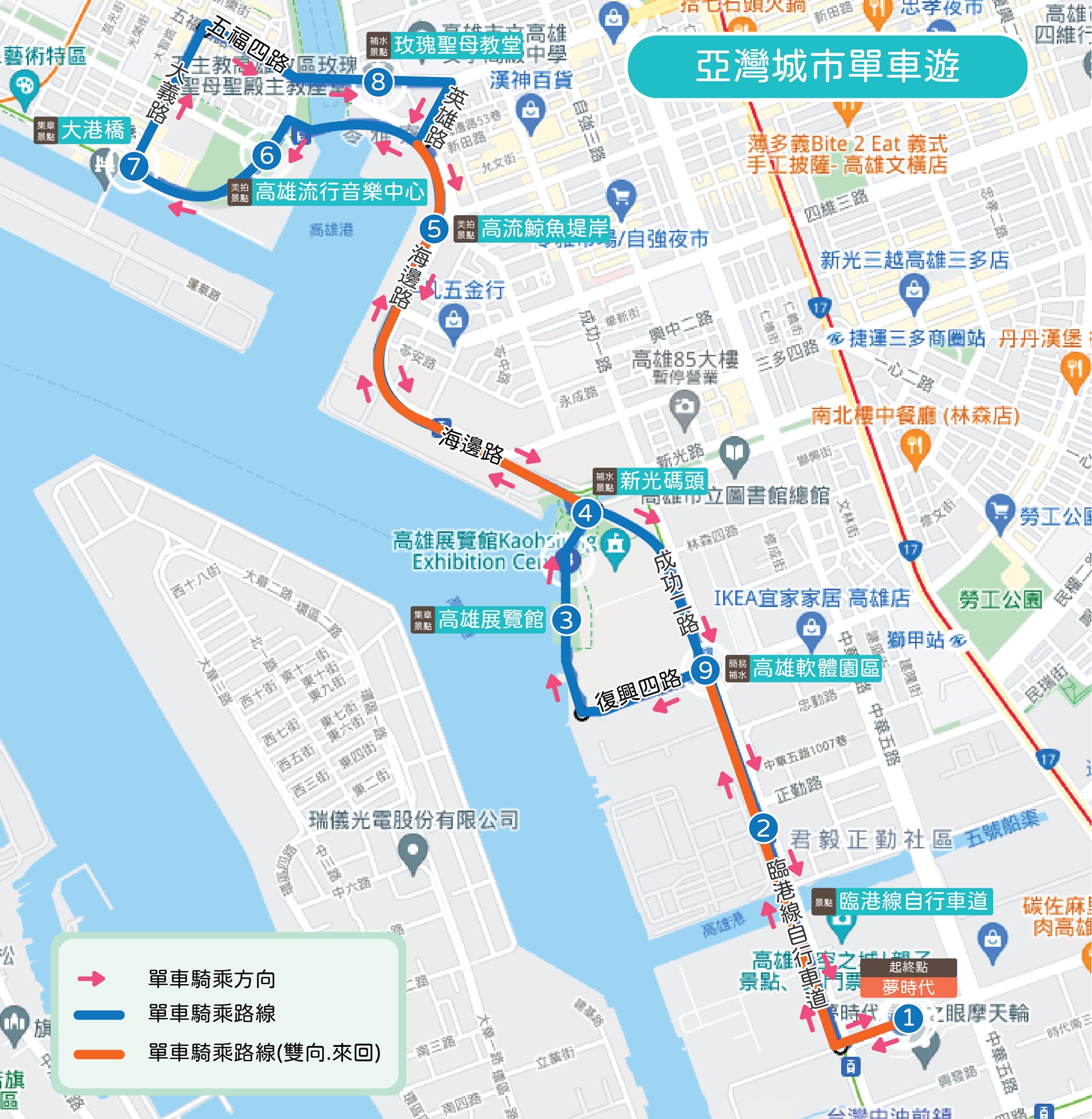 夢時代>西臨港線單車道>高雄展覽館>新光碼頭>高流鯨魚堤岸>高雄流行音樂中心>大港橋>玫瑰聖母教堂>高雄總圖>夢時代