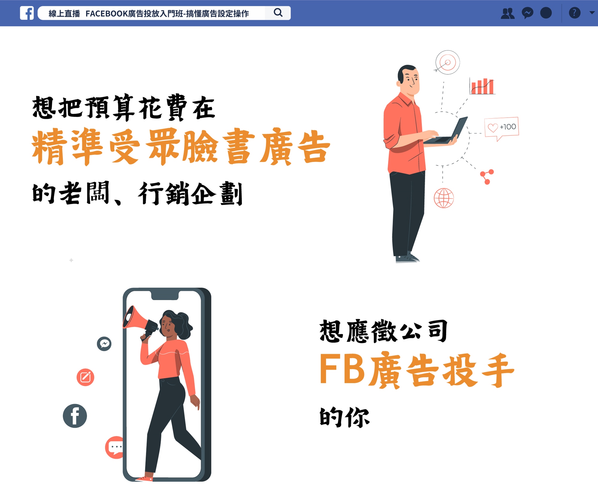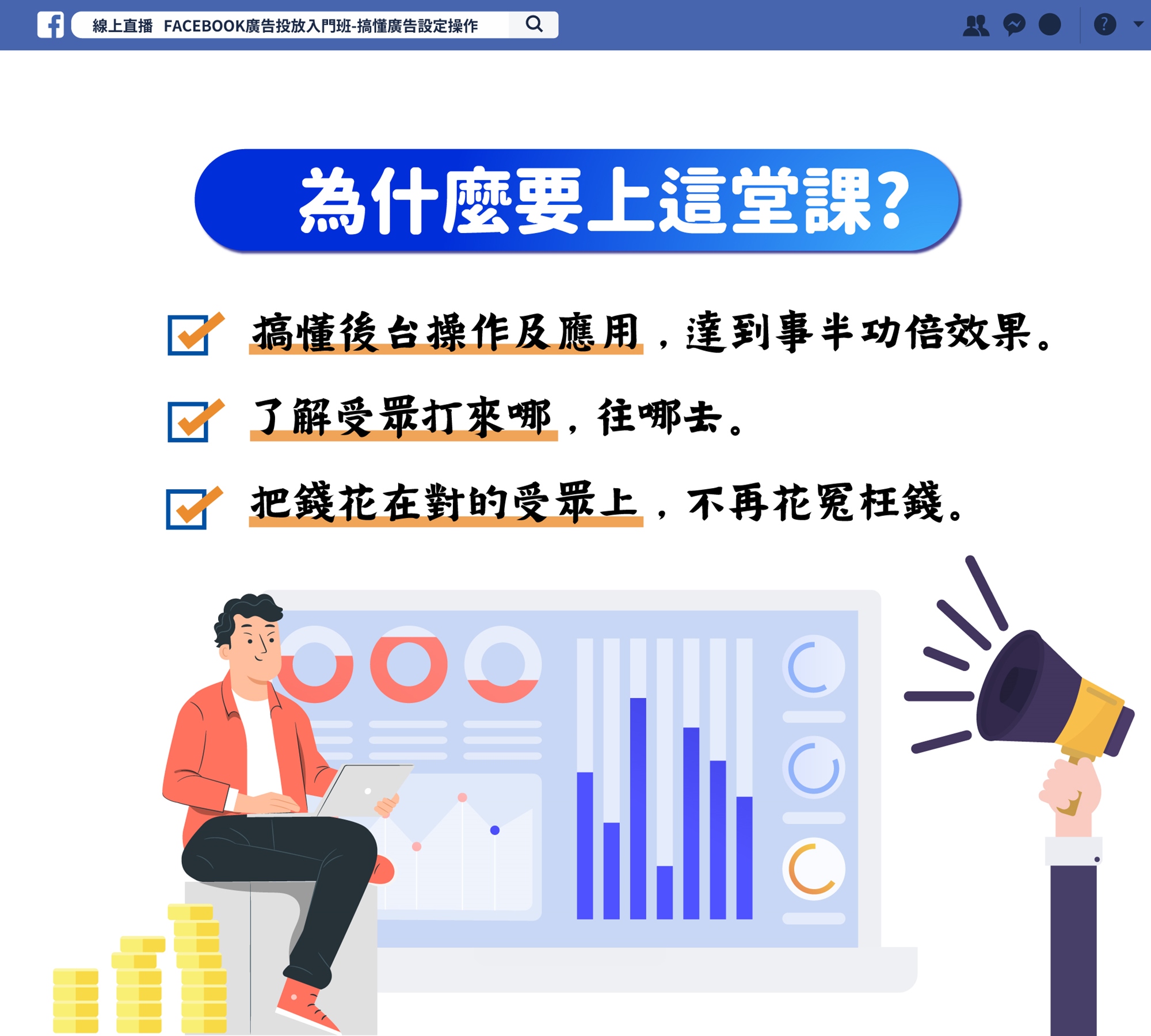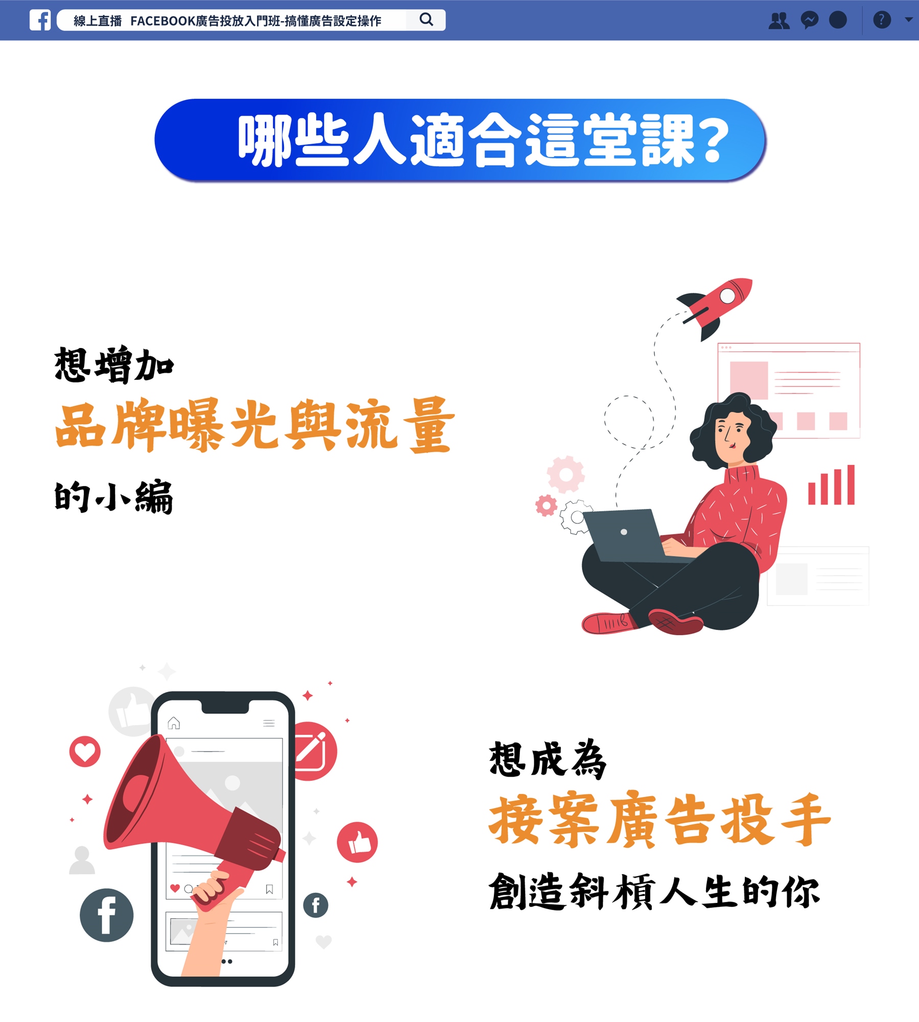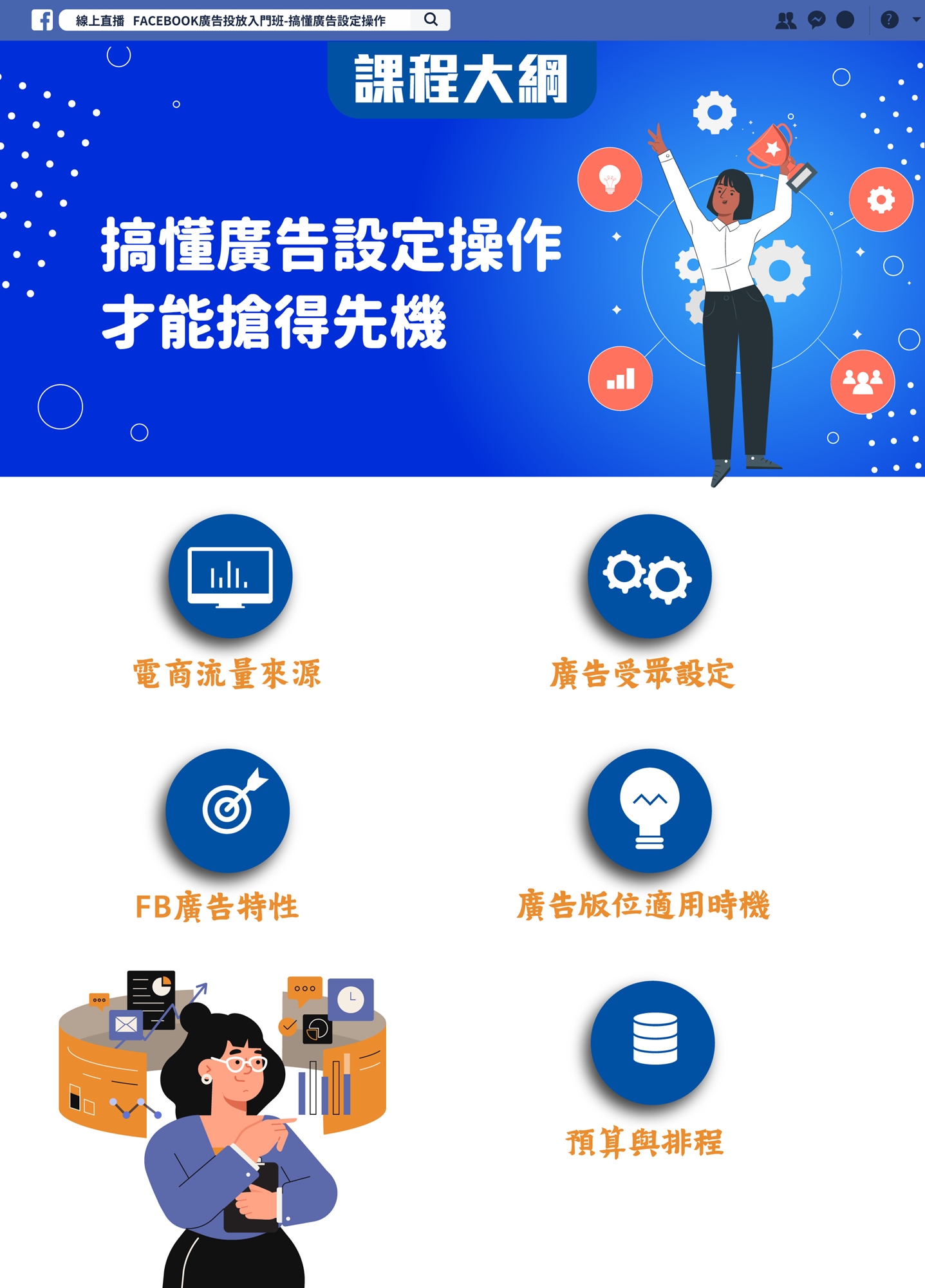 廣告帳號設立開立後,就可以開始進行廣告投放了,但廣告組合設定?受眾設定?預算設定?流量數字真的是你的受眾嗎?FB透過分析網友行為而投放的精準型廣告已成主流。但即使捨得花錢,也要懂得花在刀口上!想獲取流量增加訂單,你必須徹底了解Facebook的平台特色與廣告投放標準流程。