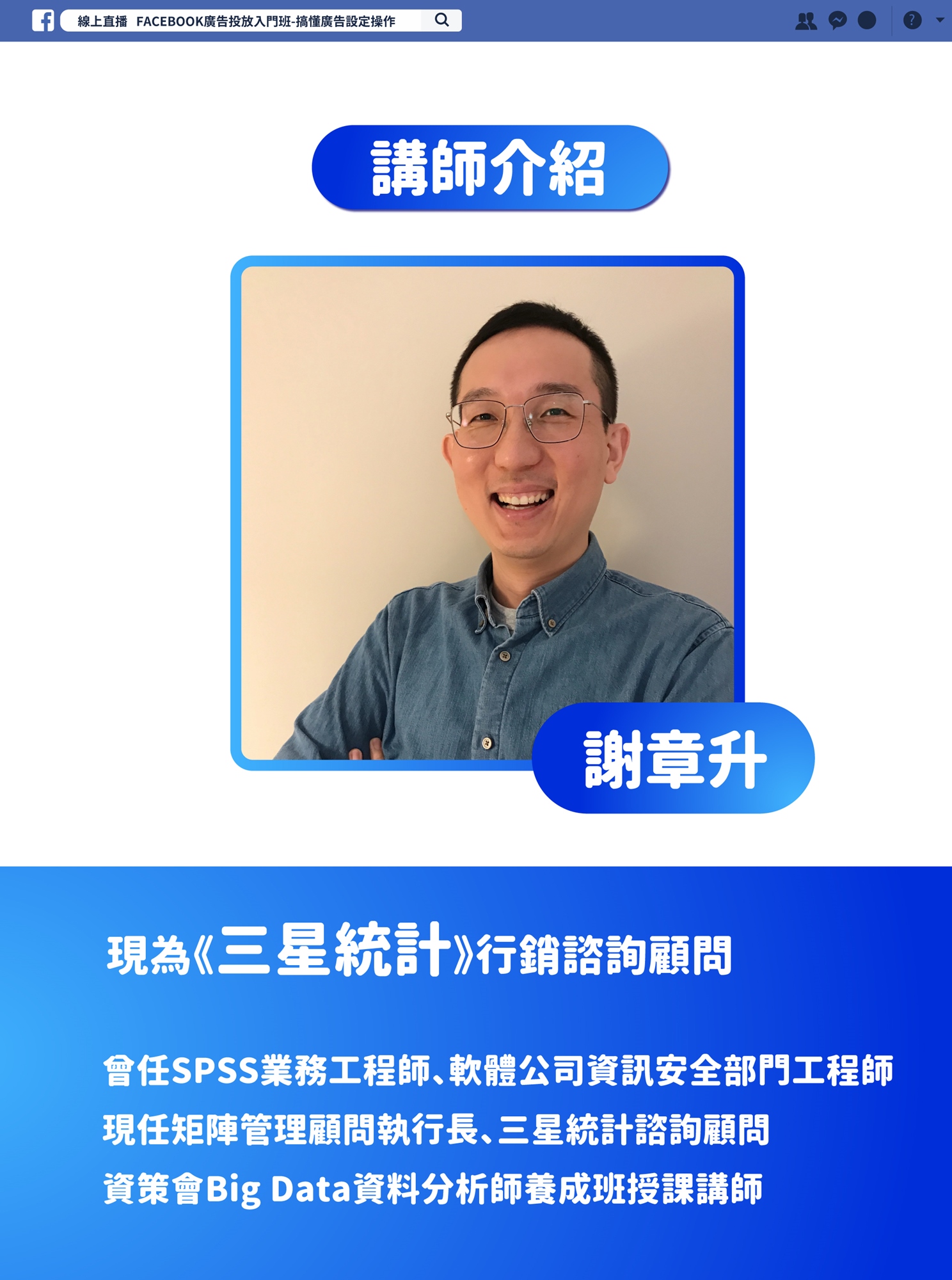 講師謝章升,現任三星統計服務有限公司教育訓練部諮詢顧問,擁有兩岸三地網路行銷與流量分析的操作經驗,專長於數據分析(SPSS、Amos、PLS、資料採礦、網絡分析)與網路行銷(網站建置、Facebook廣告、Google廣告、網站流量分析)。多次操刀跨兩岸三地的網站建置與優化、社群粉絲團行銷、關鍵字廣告、與產業競爭對手分析等專案。