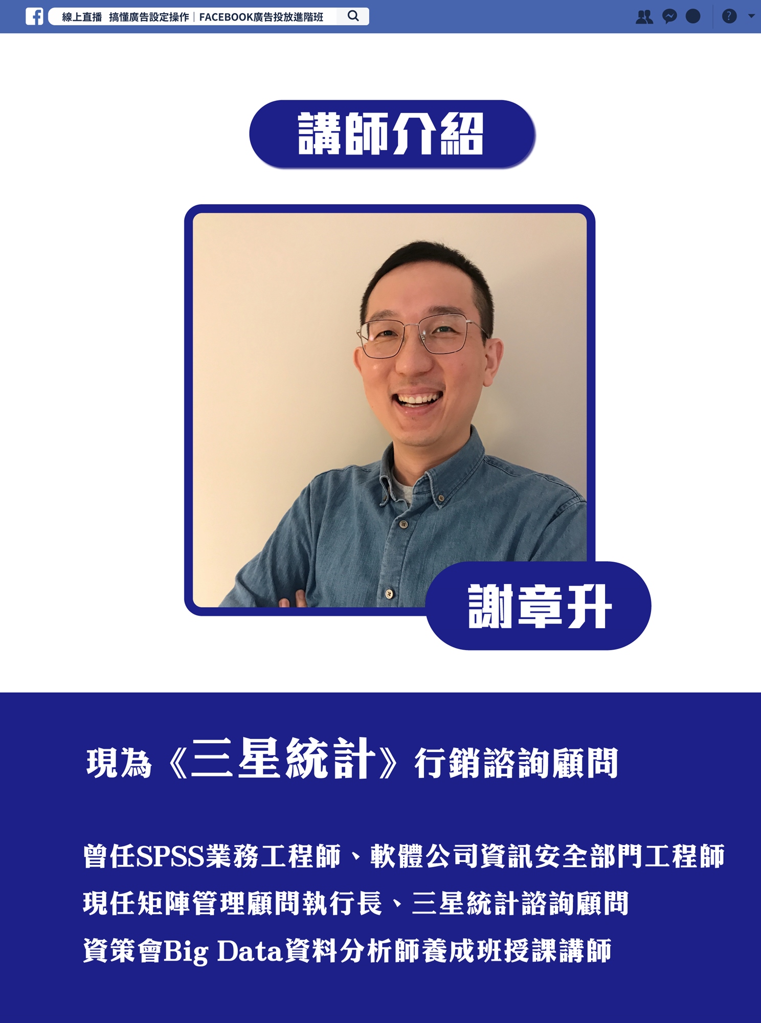 謝章升,現任三星統計服務有限公司教育訓練部諮詢顧問,擁有兩岸三地網路行銷與流量分析的操作經驗,專長於數據分析(SPSS、Amos、PLS、資料採礦、網絡分析)與網路行銷(網站建置、Facebook廣告、Google廣告、網站流量分析)。多次操刀跨兩岸三地的網站建置與優化、社群粉絲團行銷、關鍵字廣告、與產業競爭對手分析等專案。