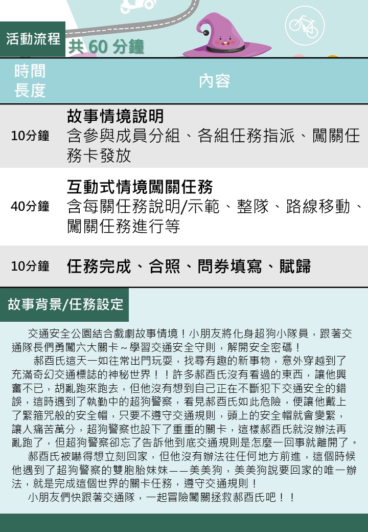 將交通公園教學區各關卡,結合故事劇場,創造情境任務。