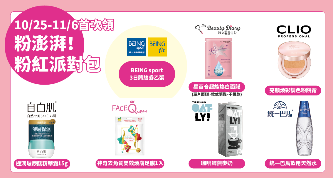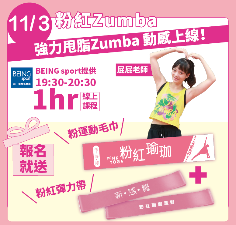 注意事項:1.粉紅Zumba活動報名自即日起至11/2 23:59截止、粉紅瑜珈活動報名自即日起至11/5 23:59截止 2.參加者(每位)可獲得粉紅派對包一份、粉紅彈力帶一份、以及BEING sport線上體驗課程序號一組;11/3粉紅Zumba場次加贈粉運動毛巾一條、11/6粉紅瑜珈場次加贈粉紅瑜珈墊一份,上述活動贈品須於2021/10/25-2021/11/6回館於7F贈品處核銷領取活動贈品,逾期恕不補發 3.圖片皆為形象參考,贈品以現場實際提供為主,恕不挑款、補贈及兌現 4. BEING sport線上體驗課程序號將於活動開始前三日以mail寄發,報名時請務必填寫正確聯絡資訊以確保活動序號提供 5.本次活動為線上體驗活動,若未於該場次指定時間體驗者,恕不補發上課時數、資格以及更換體驗場次 6.早鳥加贈禮為前177位報名成功者加贈好禮,若符合早鳥資格將於報名後三日內以mail寄發兌換憑證信件,若無則不另行通知;符合早鳥資格者須於2021/11/7-2021/11/24回館於7F贈品處領取活動贈品,逾期恕不補發7.凡完成報名手續後,若因故無法參加,恕不取消、退換及折換現金,報名費及底數亦不另行歸還,視同棄權 8.統一時代百貨台北店保有最終決定權
