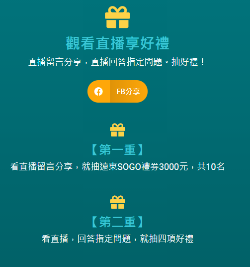 看直播留言分享,就抽遠東SOGO禮券3000元,共10名。