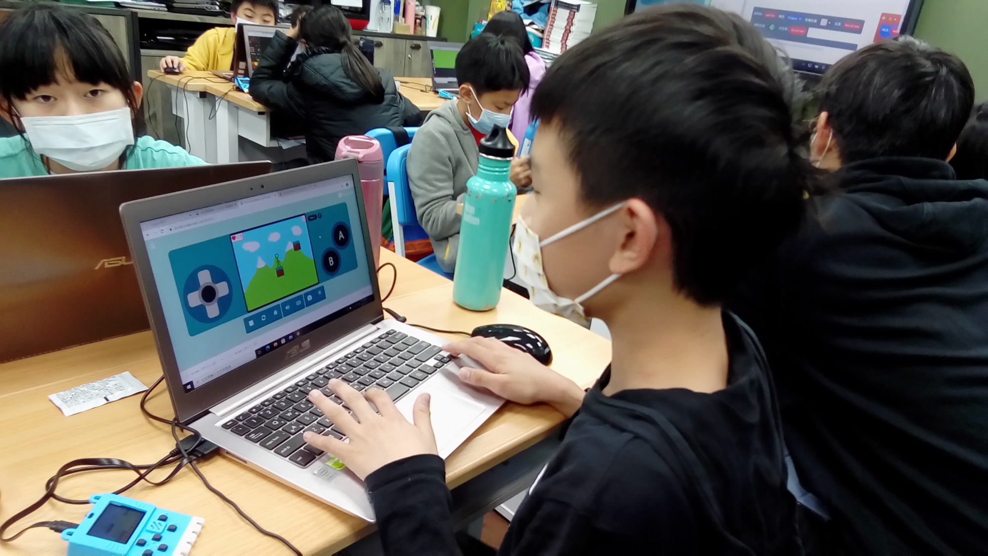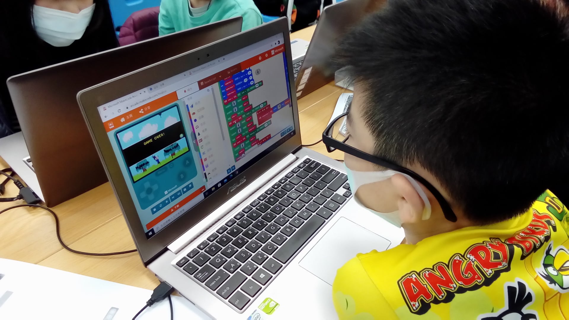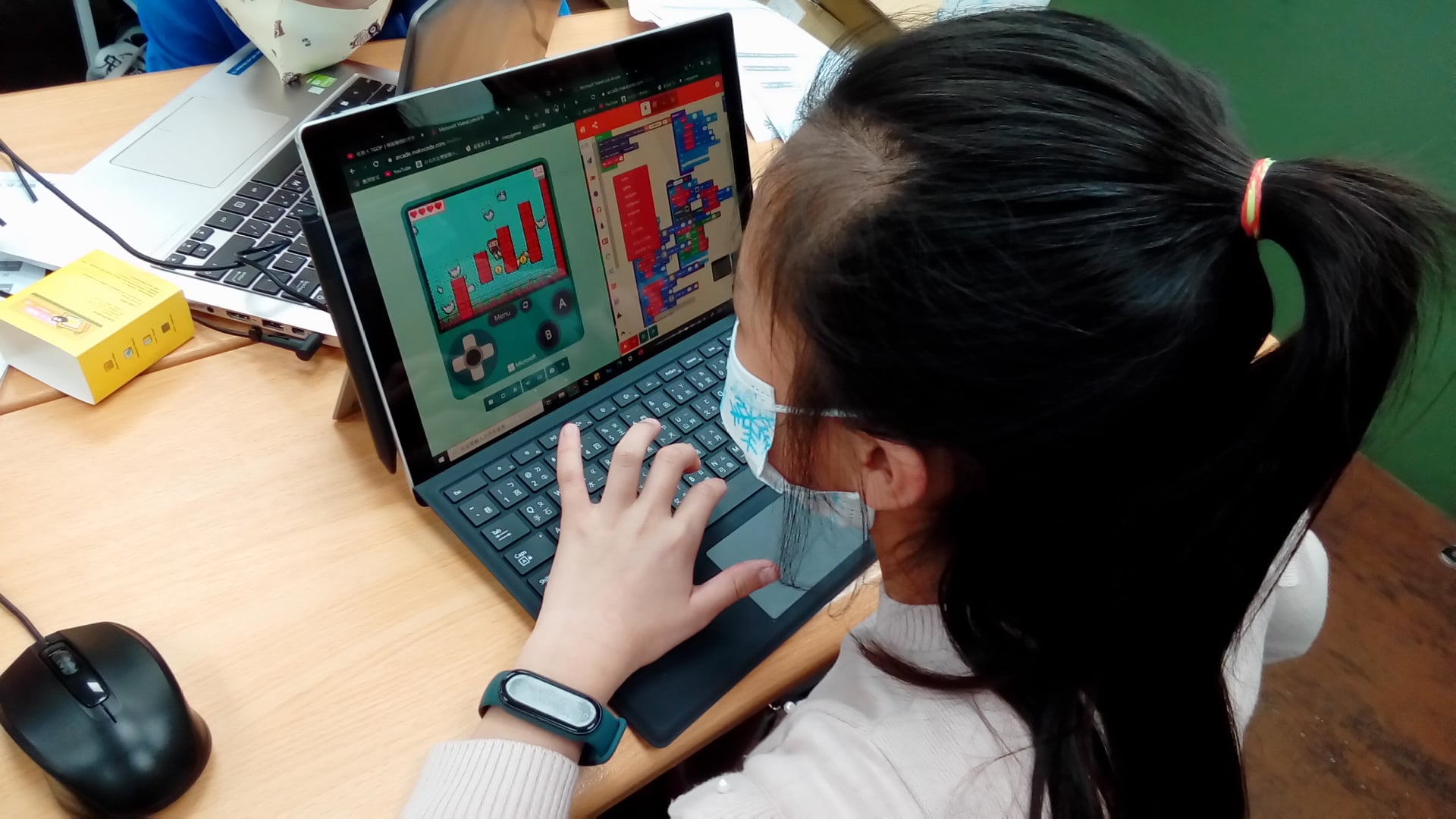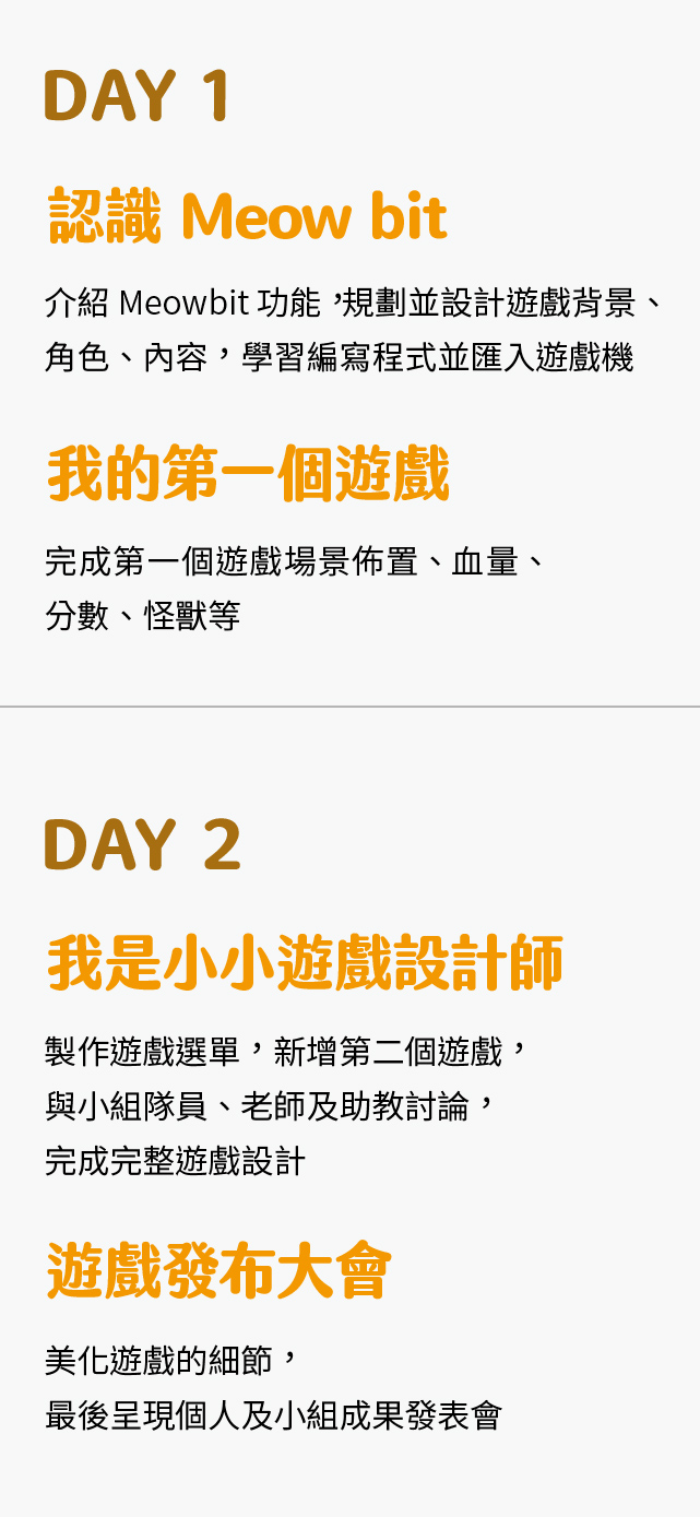 透過微軟研發的圖像化程式語言 MakeCode,結合卡片大小的掌上型遊戲機 Meowbit,教孩 子從角色設計、場景布置、關卡設定到關卡選擇,透過有趣的遊戲專題幫助孩子入門程式,在遊 戲的世界中實踐天馬行空的創意。