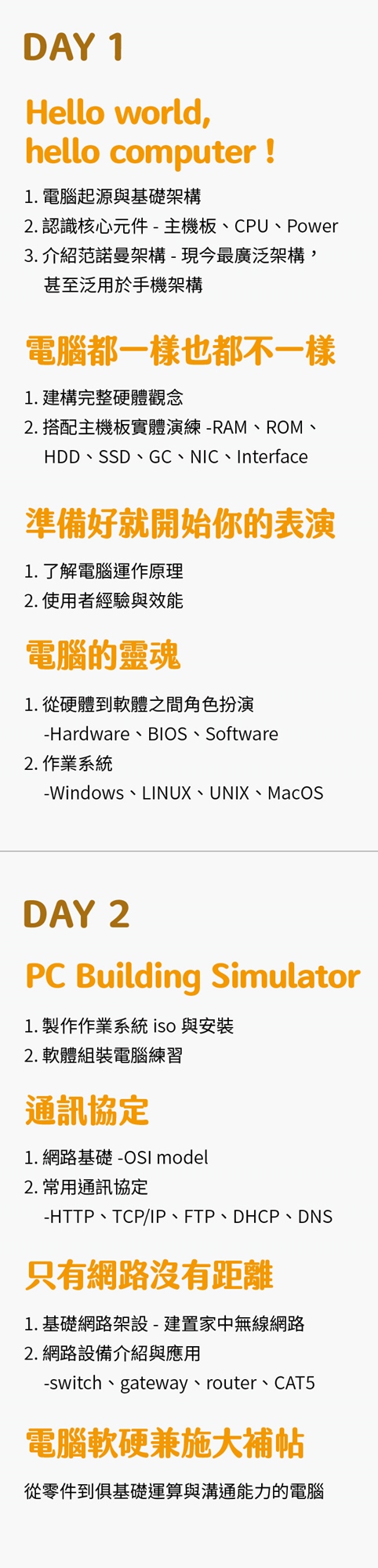 除了知識層面及 動手組裝,了解網路架設、FTP 伺服器架設、Apache 伺服器架設、Wireshark 網路封包分析 等知識,同時結合了 PC Building Simulator 虛擬組裝遊戲競賽,讓課程不只專業、趣味,也 與眾不同。