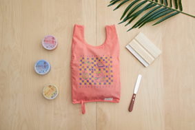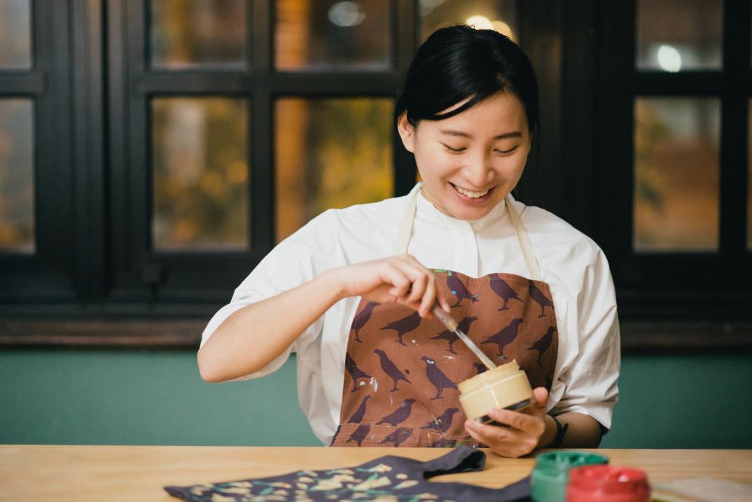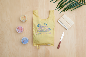 以活動主視覺為要元素,製作 4個圖案絹版。客人可以自由挑選喜愛的圖案與位置絹印,每個人都可以印製出獨一無二的絹印袋。
