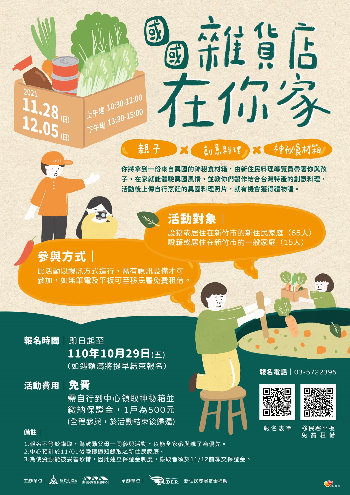 你將拿到一份來自異國的神秘食材箱 📦,由新住民料理導覽員帶著你與孩子,在家就能體驗異國風情,並教你們製作結合臺灣特產的創意料理,活動後上傳自行烹飪的異國料理照片,就有機會獲得禮物🎁喔!