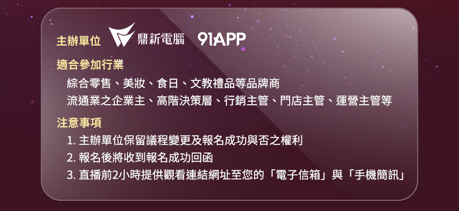 本活動針對企業客戶舉辦,主辦單位保留修改活動細節與報名成功與否的權利,無須事前通知,並有權對本活動所有事宜作出解釋或裁決。