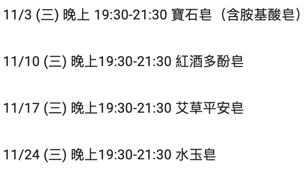 11/3 、11/10 、 11/17 、11/24 晚上 19:30--21:30 共四堂