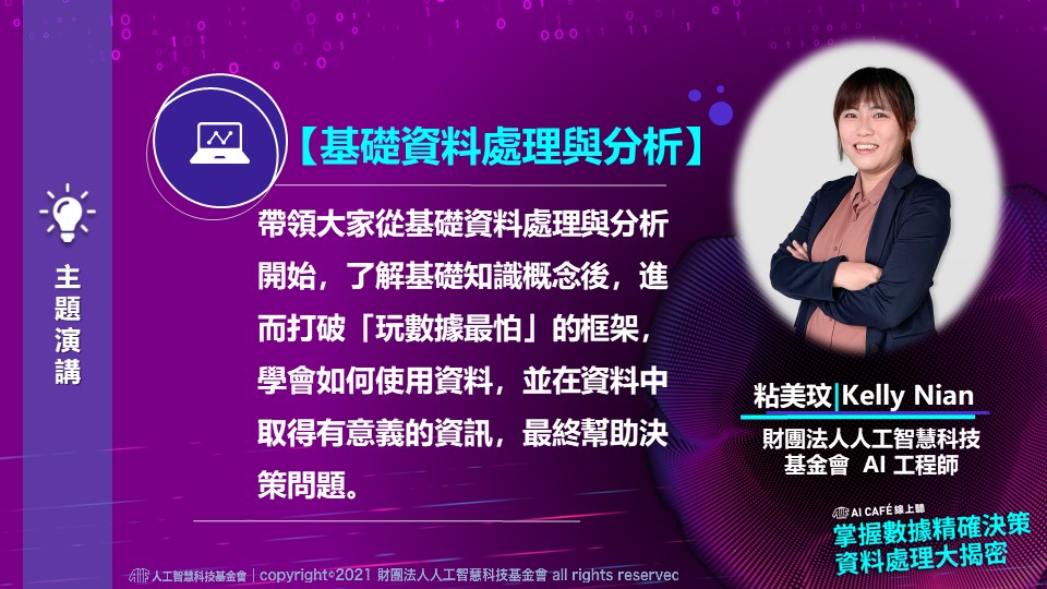 財團法人人工智慧科技基金會的 AI 工程師粘美玟,將帶大家瞭解資料的特性與使用方式,從資料中萃取出重要的訊息,導入 AI 專案,幫助大家快速了解資料科學的奧秘;學會如何處理與分析、解決資料中潛在問題並進行專案決策。