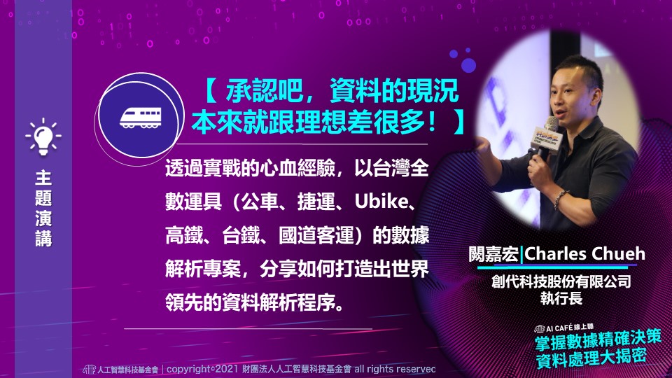 創代科技股份有限公司闕嘉宏執行長透過實戰的心血經驗,以台灣全類別電子票證及全公共運具的數據解析專案,分享如何打造世界領先的資料解析程序。