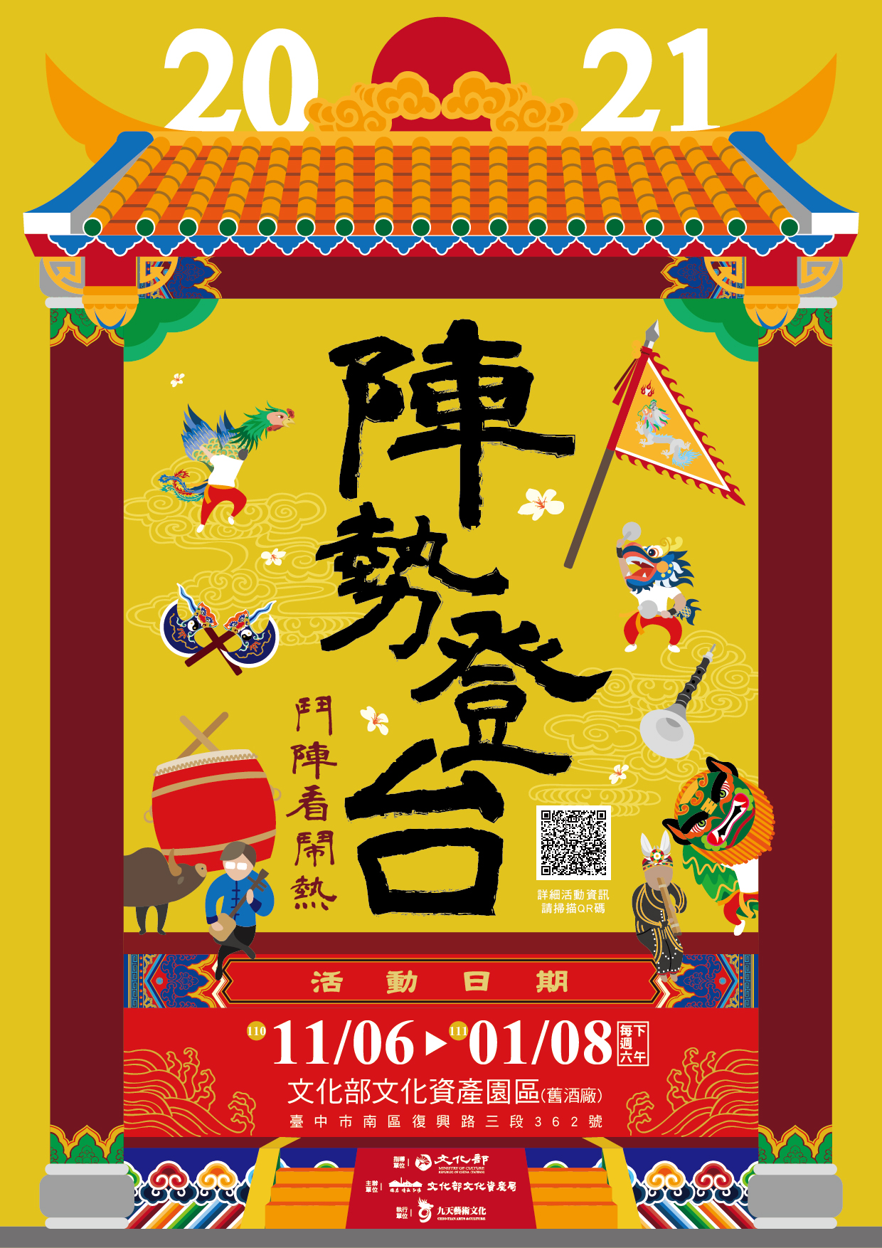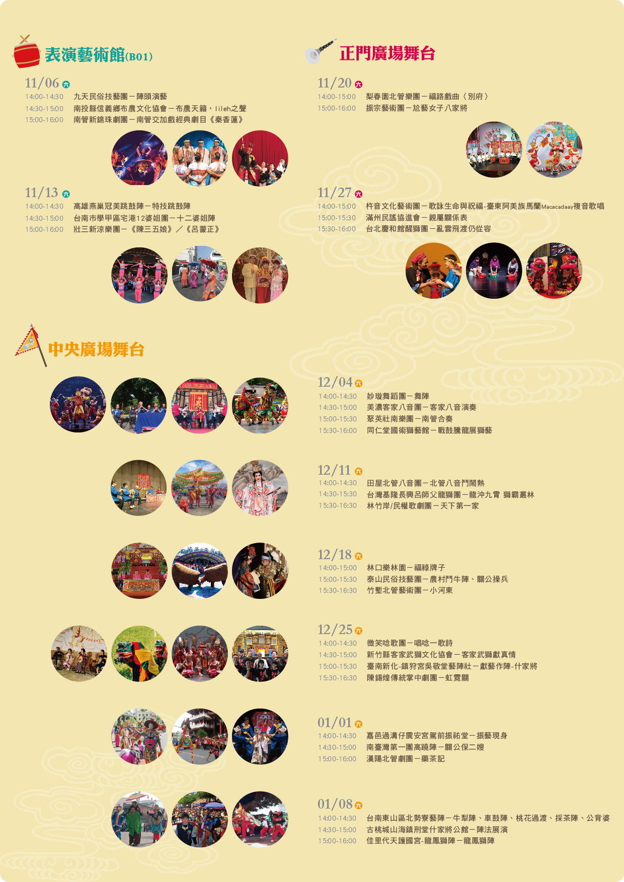 演出節目分別為民俗文陣、武陣、傳統音樂、原住民樂舞、唸歌、客家八音等豐富內容!
