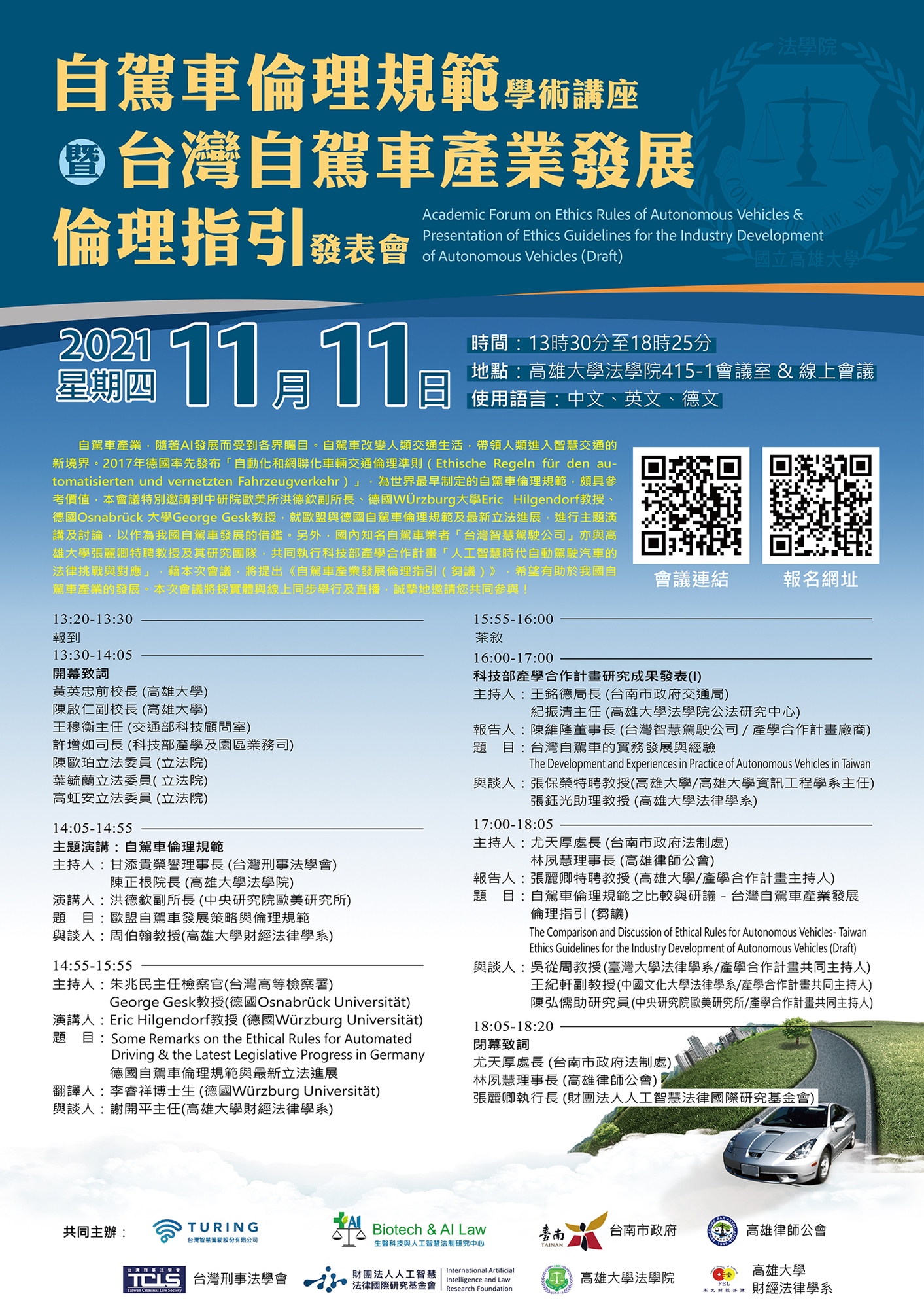 國內知名自駕車業者「台灣智慧駕駛公司」亦與高雄大學張麗卿特聘教授及其研究團隊,共同執行科技部產學合作計畫「人工智慧時代自動駕駛汽車的法律挑戰與對應」,藉本次會議,將提出《自駕車產業發展倫理指引(芻議)》,希望有助於我國自駕車產業的發展。