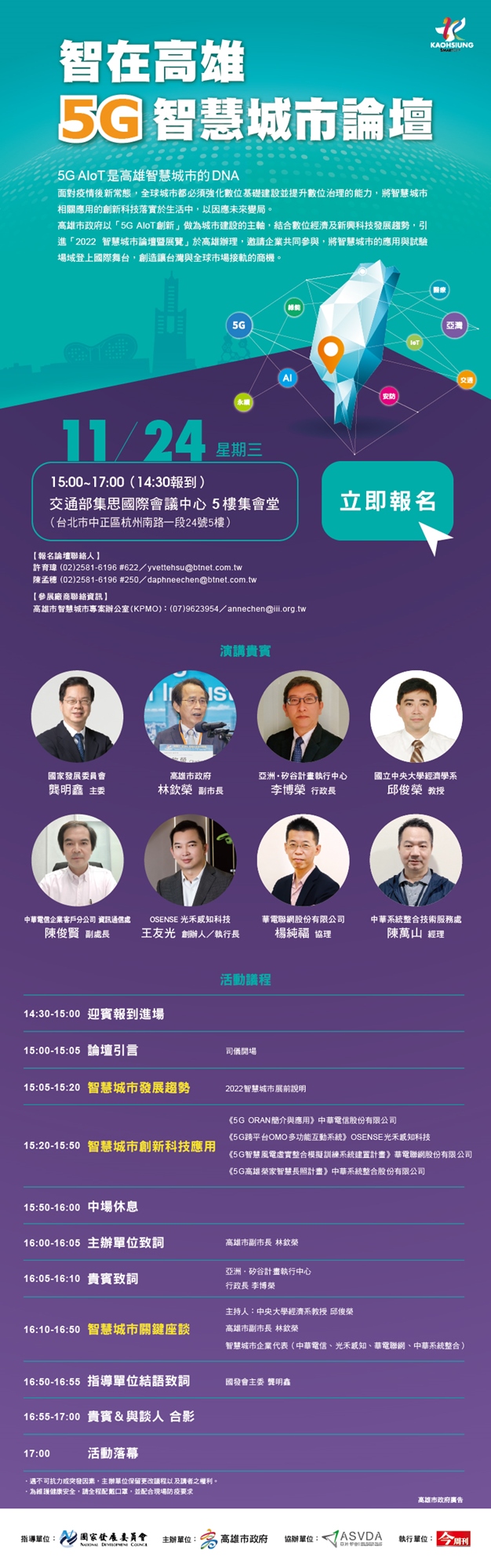 高雄市政府以「5G AIoT創新」做為城市建設的主軸,結合數位經濟及新興科技發展趨勢,引進「2022智慧城市論壇暨展覽」於高雄辦理,邀請企業共同參與,將智慧城市的應用與試驗場域登上國際舞台,創造讓台灣與全球市場接軌的商機。