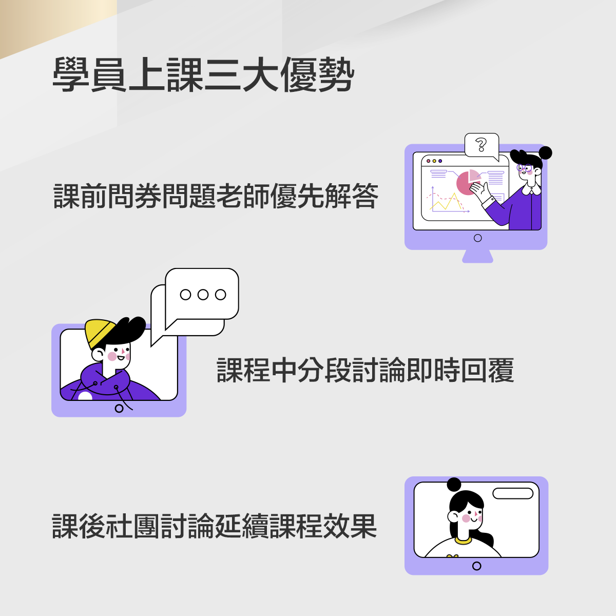 - 報名完成後,請務必先填寫課前問券,已讓老師更加了解參加者的資訊並可事先於問券中先提出你的問題,我們將在課中討論時間先為您優先做解答。