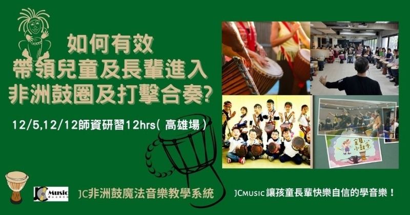 2.在中國大陸及台灣已經推廣落地實踐三年多並普遍運用在幼兒園及小學的JC非洲鼓兒童教程,第一次在台灣舉行師資培訓.課程內容不僅適用兒童,亦適用於銀髮族長者及長青關懷站老人院..等