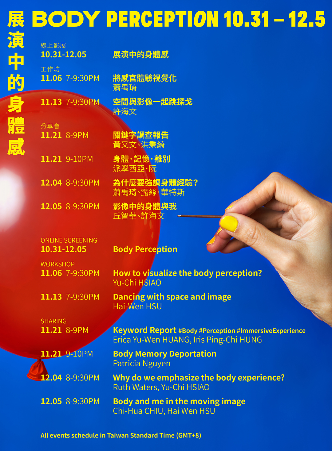 The Body Perception project consists of 3 online workshops, 2 shared discussions, and a series of online screenings. We aim to build a platform to co-learn, discuss, and explore the body and perception within the exhibition and performance.