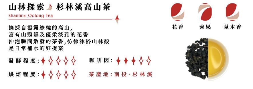 摘採自雲霧繚繞的高山、優柔淡雅的花香、沖泡瞬間散發的茶香彷彿沐浴山林般