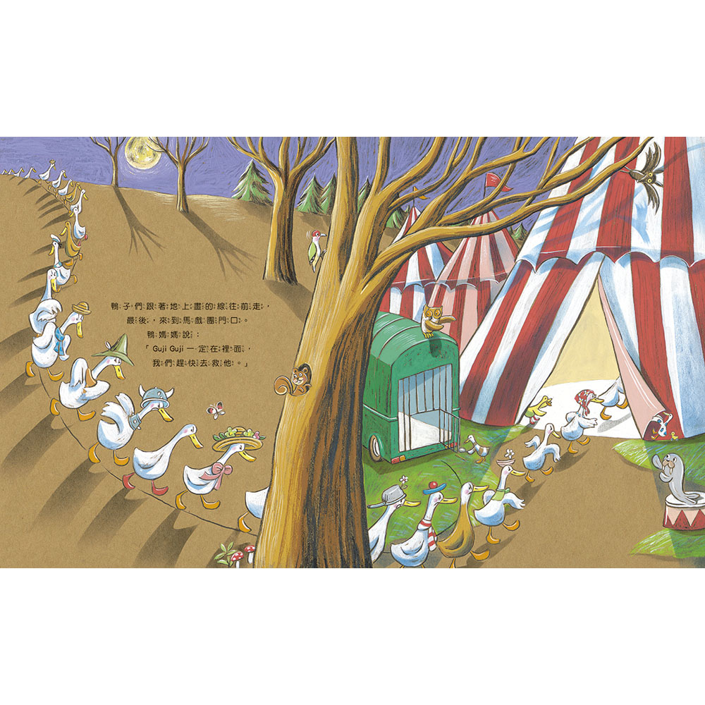 同樣圍繞鴨子湖的人物與場景,藉由Guji Guji失蹤到馬戲團的故事,帶孩子看見馬戲團動物被非法對待的處境,讓人心生不捨,省思人類的自私行為,油然升起為保育動物盡一份心力的決心,學習善待與尊重每個動物的生命。