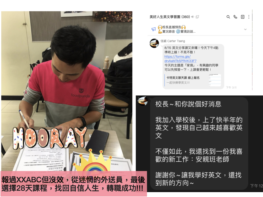 Carter在2020年2月左右報名課程,他原是一位缺乏自信的外送員,因為不喜歡朝九晚五的工程師工作,離職探索人生,無意中看到我們的說明會,參加後隔天就付款完成參加我們的課程,二個月他就突破自我,完成人生第一篇英文自我介紹演說,課程中他不但完成成為英文分享者的夢想,舉辦公益線上英文學習分享會,在課程準備結束前,更確立新的志業 - 教育,他找到了兒童教育的工作。從外送員到教育工作者,這門英文課不但讓他自信說出英文,也讓他改變自己了的人生。