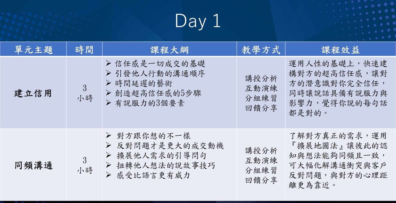 Ans:本課程相當適合『需要快速建立信任感與影響力,進而引發對方的成交動機,自己說服自己買單你的服務、產品、溝通目的』的族群;職場上特別適合需要開發B2B的企業主或工作者、需要諮商才能成交的業務銷售人員、組織面臨擴編與徵才需求的主管們。若非業務類型工作者,想建構自己對於他人的溝通影響力,願意付諸行動者歡迎學習!