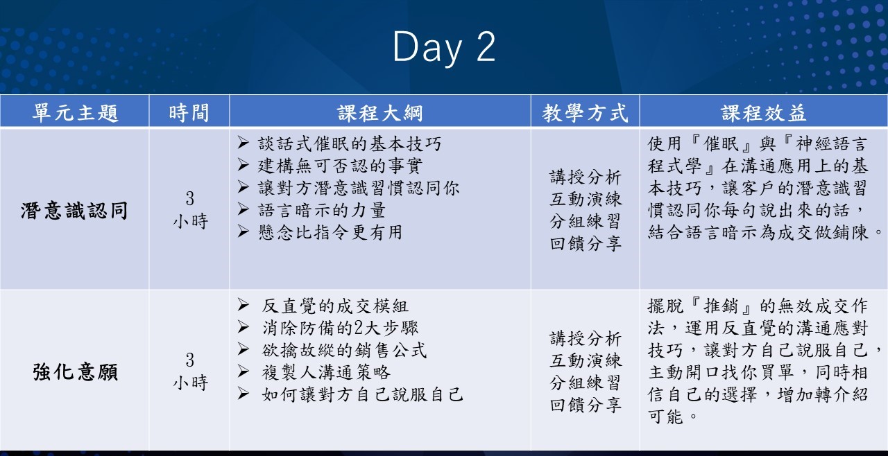 從創造「信任感」的公式、到探索「深層需求」的關鍵、以及讓對方連續「潛意識認同」談話催眠秘訣,最終整合成客戶「自己說服自己」的成交步驟,運用體驗式教學模式,讓你學習到、體驗到、並且帶著走!