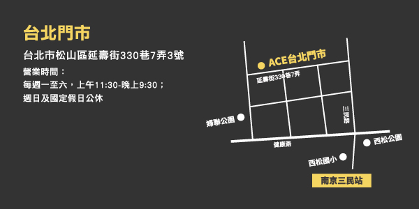 📌活動地點:台北市松山區延壽街330巷7弄3號 (ACE台北門市)