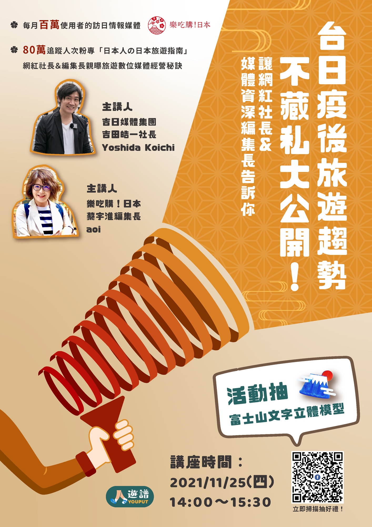 有趣、深度、高含金量的講座在這裡!想聽聽吉田社長及蔡編集長的所見所聞、多年來經營訪日情報媒體《樂吃購!日本》與Facebbook粉專《日本人の日本旅遊指南》所觀察到的旅遊產業和數位媒體發展趨勢嗎?機會難得,快相約三五好友線上齊聚,一起來切磋交流吧!11/25 (四) 14:00-15:30 與你不見不散!