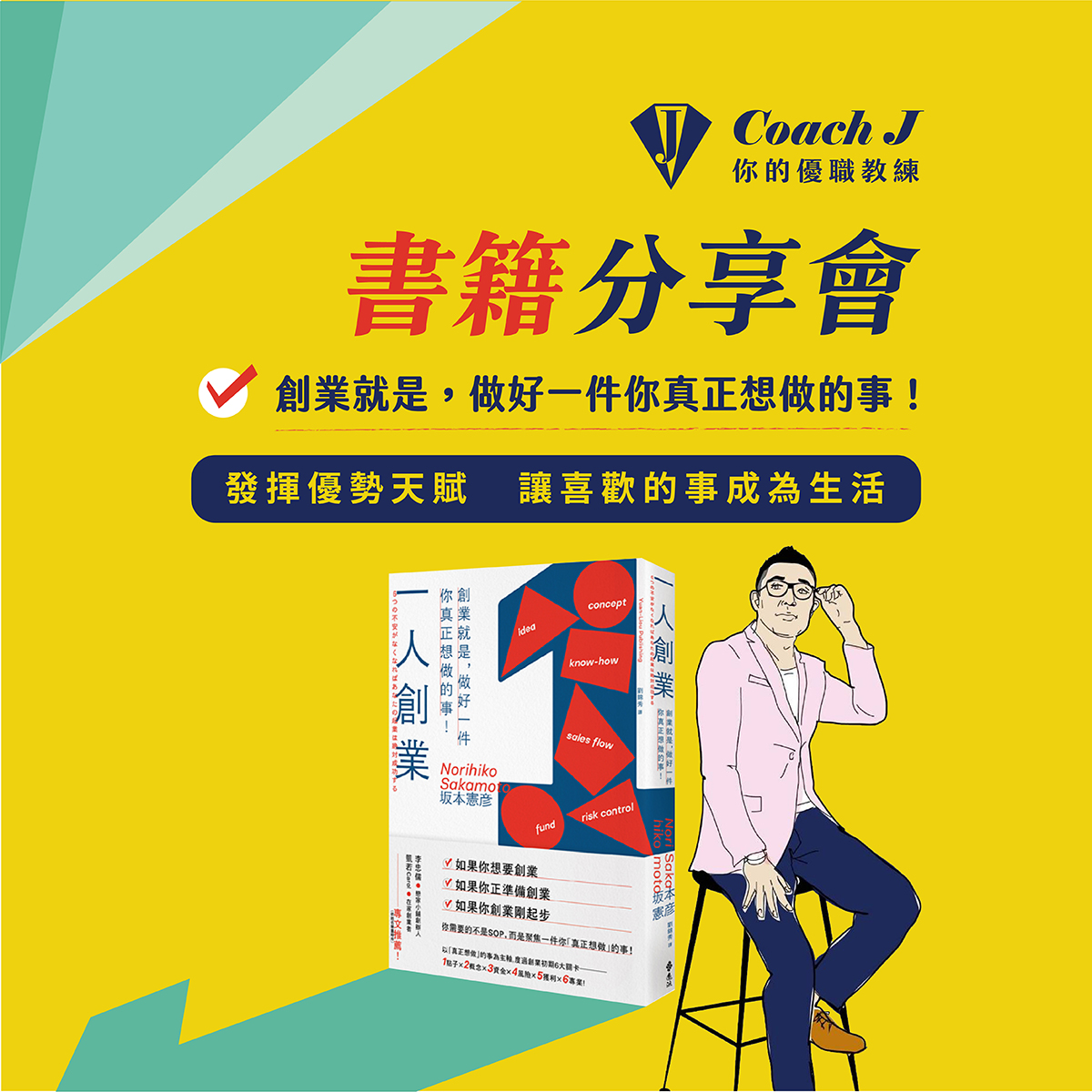 台灣認證首位美國蓋洛普Gallup國際優勢教練 Coach J Jerry 顏瑋志將為大家導讀《一人創業:創業就是,做好一件你真正想做的事!》,書中作者提出「個人軸」的創業概念相當有趣,與蓋洛普Gallup擅用自己的優勢天賦不謀而合,正因為是自己真正喜歡的事情,所以不會感到不耐煩!