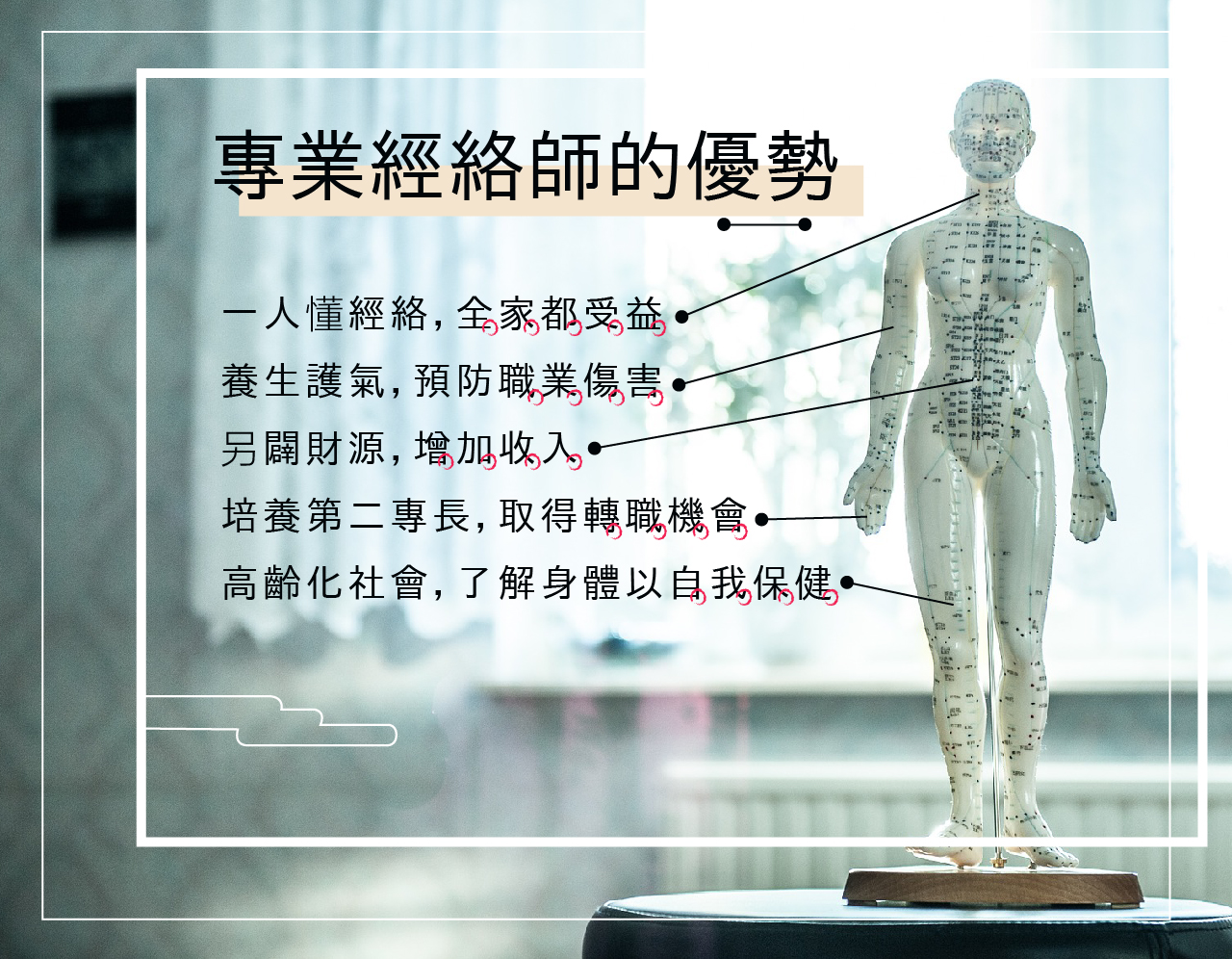 四、專業經絡師的未來發展、職場概況、海外職場、生涯規劃。